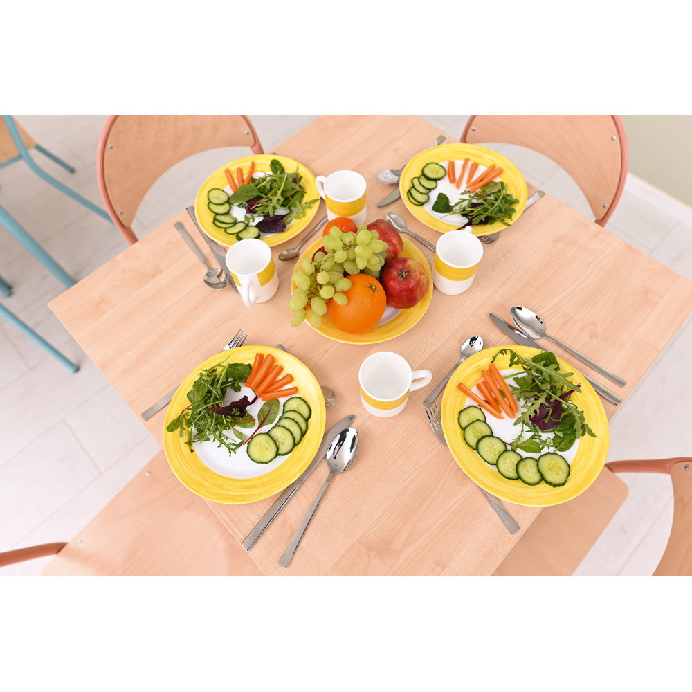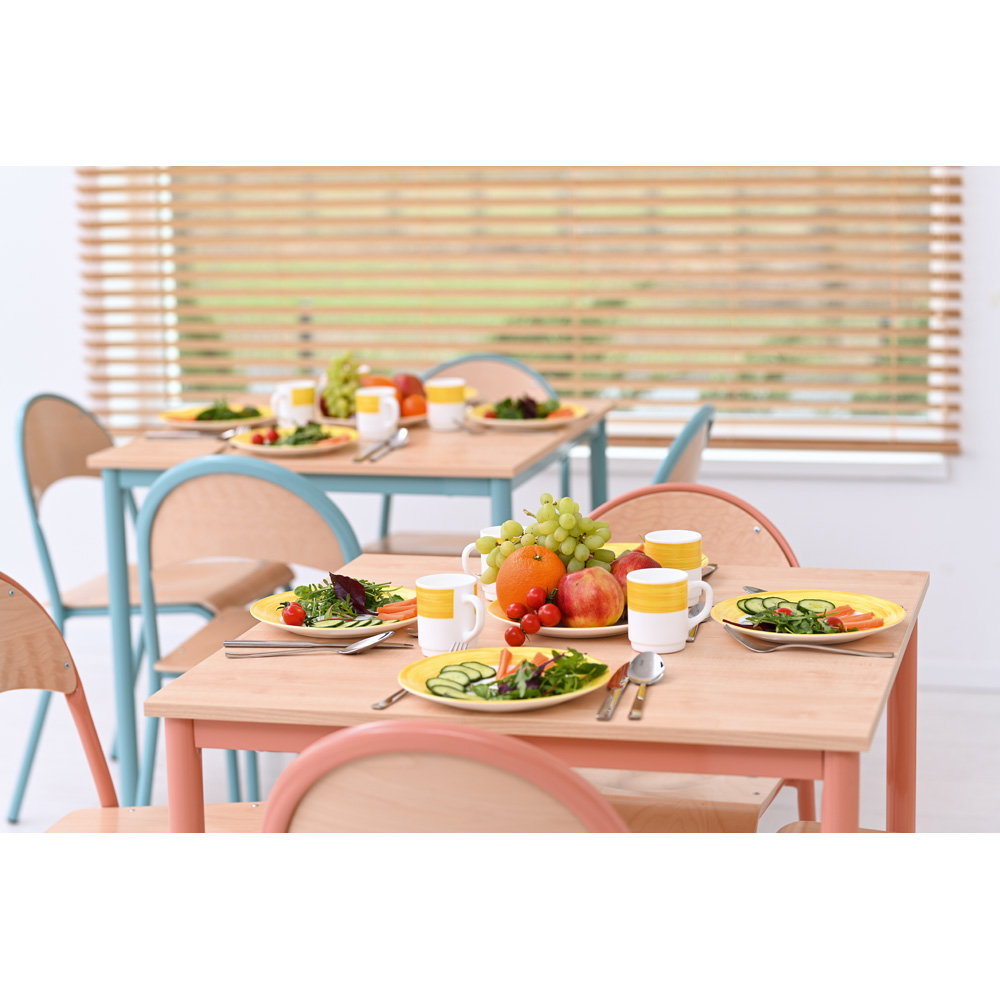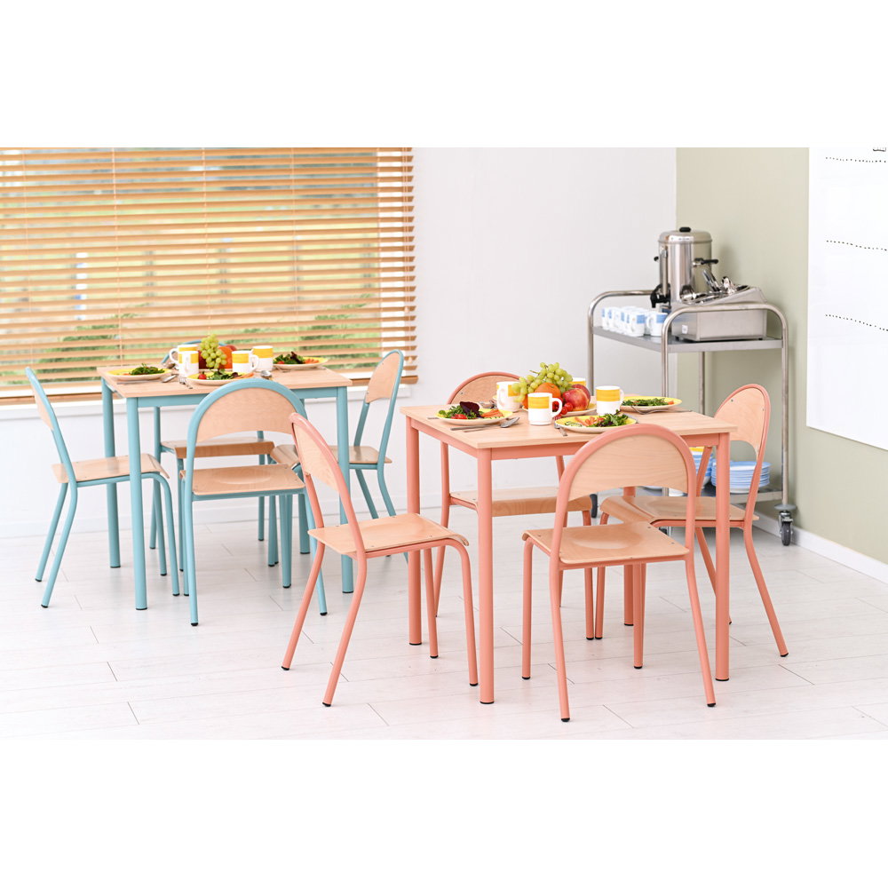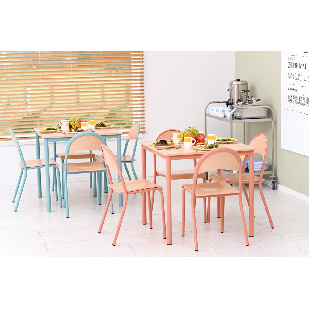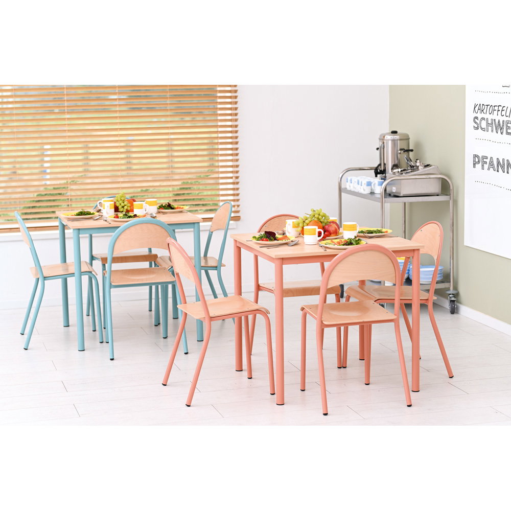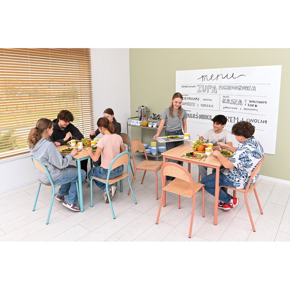 Farben beeinflussen die Stimmung in einem Raum maßgeblich. Die Gestelle des Tisches und der Stühle sind in einem dezenten, aber frischen Apricot gehalten. In Kombination mit der natürlichen Tischplatte im Dekor Ahorn E und den Sitzschalen aus Buche entsteht ein freundliches, einladendes Gesamtbild. Diese Gestaltung wirkt positiv auf die Lernumgebung, ohne visuell zu überreizen. - Kompakte Maße für vielseitige Einsatzmöglichkeiten