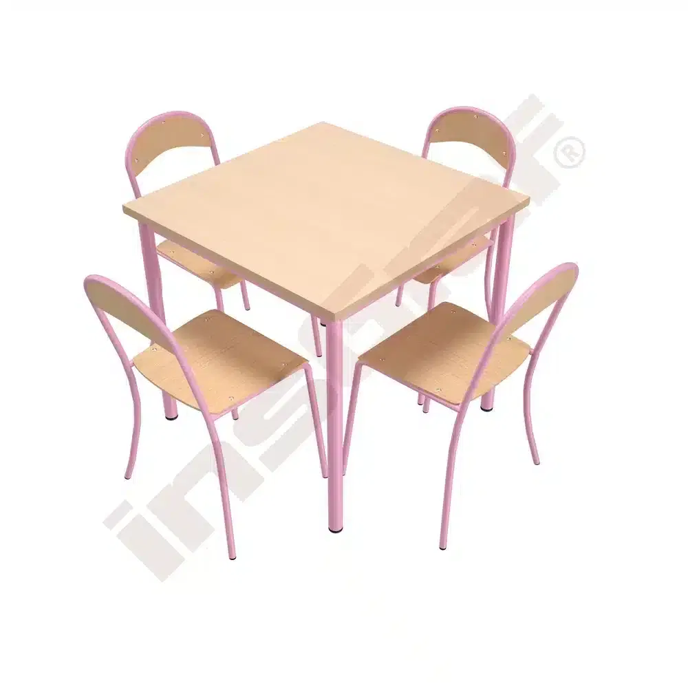 Verleihen Sie Ihrem Raum eine charmante Atmosphäre mit unserem Tisch Mila (80×80 cm) mit Stühlen P, rosa, Sitzhöhe: 46 cm (Set Nr. 184 – Gr. 6). Diese stilvolle Kombination bringt Frische und Funktionalität in jede Arbeits- und Lernumgebung.