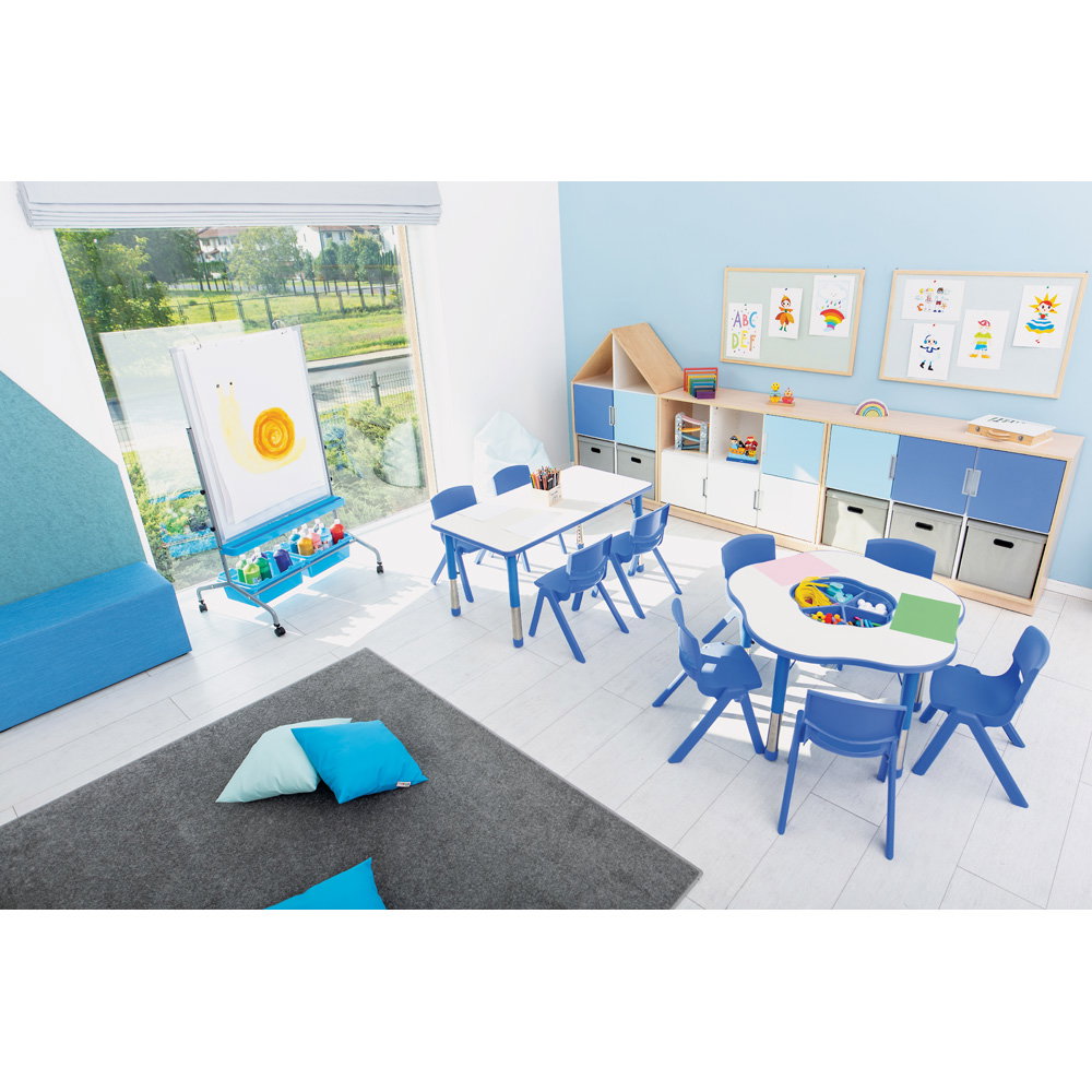 Bringen Sie Leben in den Gruppenraum! Die Kombination aus weißer Tischplatte und farbigen Kanten sowie Beinen (erhältlich in Gelb, Grün, Oliv, Blau und Rot) schafft eine freundliche und einladende Atmosphäre, in der sich Kinder wohlfühlen. - Bodenschonend und standfest