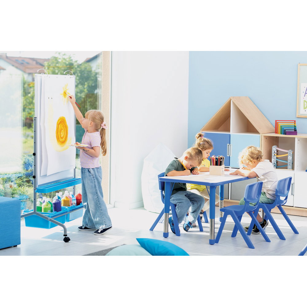Ein weiteres Highlight ist die ergonomische Flexibilität. Die stabilen Stahlbeine sind höhenverstellbar von 40 bis 60 cm. So lässt sich der Tisch im Handumdrehen an die Körpergröße der Kinder anpassen – ideal für Einrichtungen, die Kinder unterschiedlicher Altersstufen betreuen. Bodenschonende Kunststoffkappen an den Füßen verhindern Kratzer auf dem Parkett oder Linoleum und sorgen dafür, dass der Tisch auch mal verschoben werden kann, ohne Spuren zu hinterlassen.