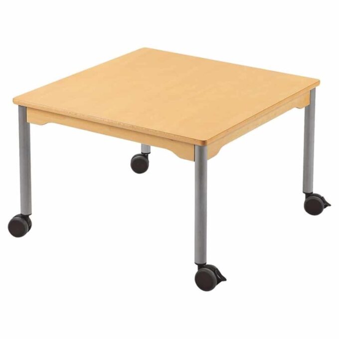 Tisch quadratisch 80×80 cm – mit beschichteter Tischplatte mit Beinen aus grauem Metall und Rollrädern für Kindergarten und Krippe
