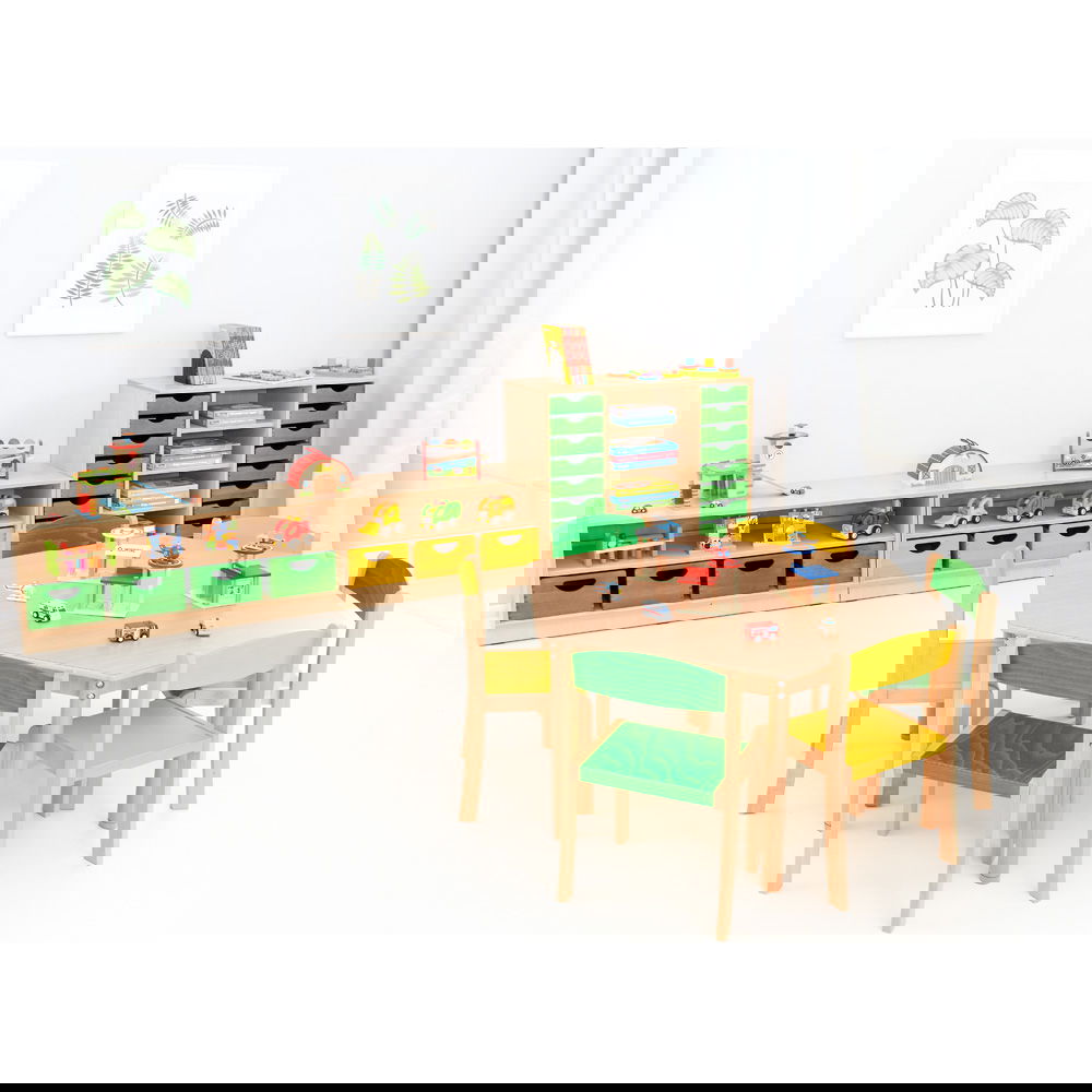 Die Raumgestaltung in der Krippe spielt eine wesentliche Rolle für die frühkindliche Entwicklung. Möbel für die Kleinsten müssen nicht nur sicher und robust sein, sondern auch soziale Interaktionen fördern. Das Set aus dem sechseckigen Tisch im warmen Buche-Dekor und sechs bunten Stühlen der Serie Philip bietet Ihnen eine durchdachte und alltagstaugliche Lösung für Ihre Einrichtung.