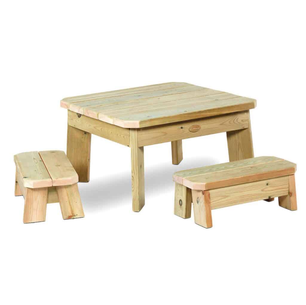 - Lieferumfang: 1 quadratischer Tisch, 2 Bänke.