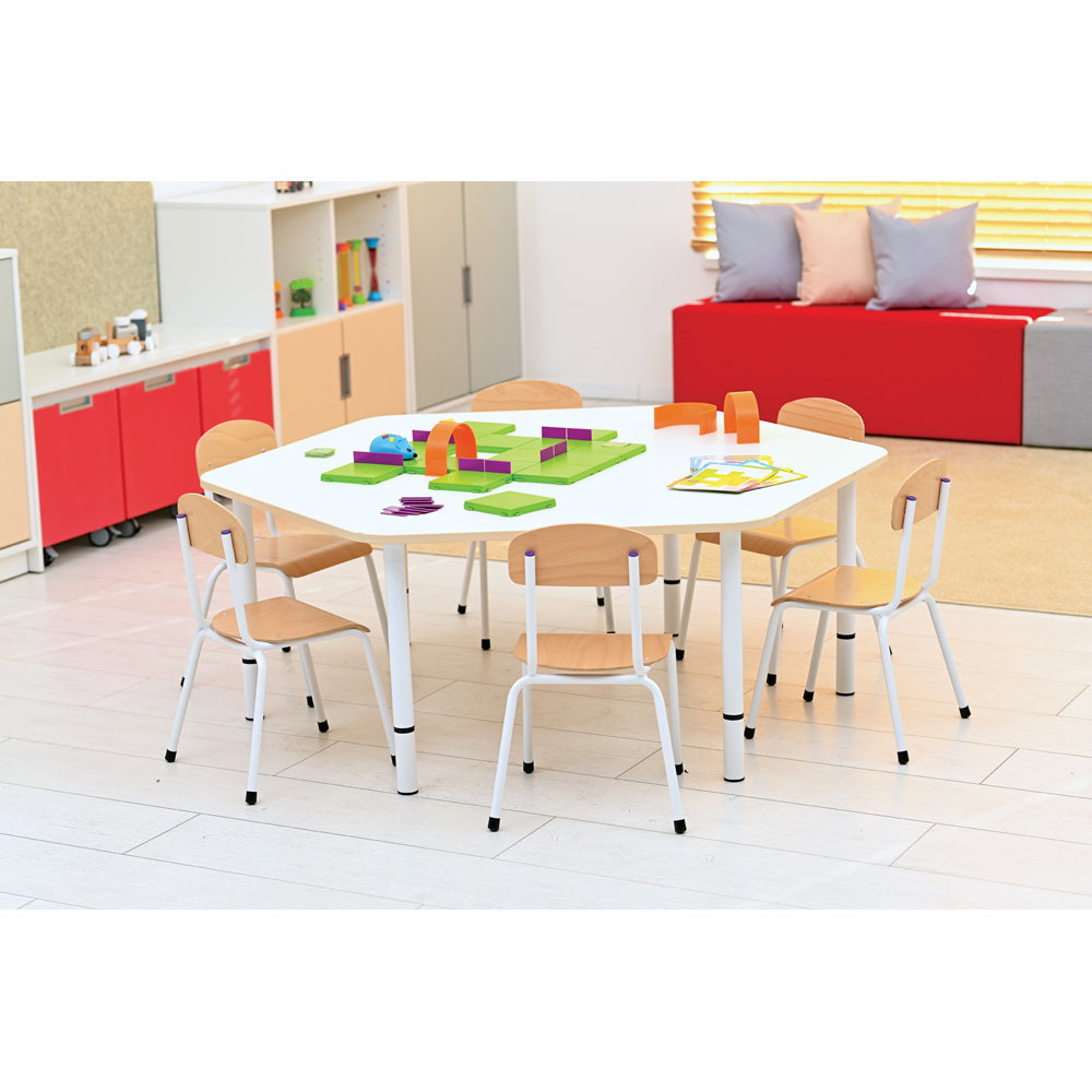 Eine runde Tischform bringt Kinder auf ganz natürliche Weise zusammen. An der runden Tischplatte Quadro mit einem großzügigen Durchmesser von 120 Zentimetern hat jedes Kind alle anderen im Blick. Das fördert die offene Kommunikation und stärkt das Gemeinschaftsgefühl in Kindergärten, Horten und Schulen. Diese Tischplatte bildet das perfekte Zentrum für interaktive Gruppenarbeiten, kreative Bastelprojekte und harmonische Spielrunden.