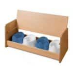 Die Bank ist aus robustem Buche Multiplex gefertigt, und die 25 mm starke Sitzfläche ist im eleganten Dekor Buche erhältlich. Der klappbare Deckel kann arretiert werden, sodass er sicher offen bleibt und die Handhabung erleichtert. Diese Bauweise sorgt für Langlebigkeit und Stabilität und schafft gleichzeitig eine ansprechende und einladende Atmosphäre im Sanitärbereich.