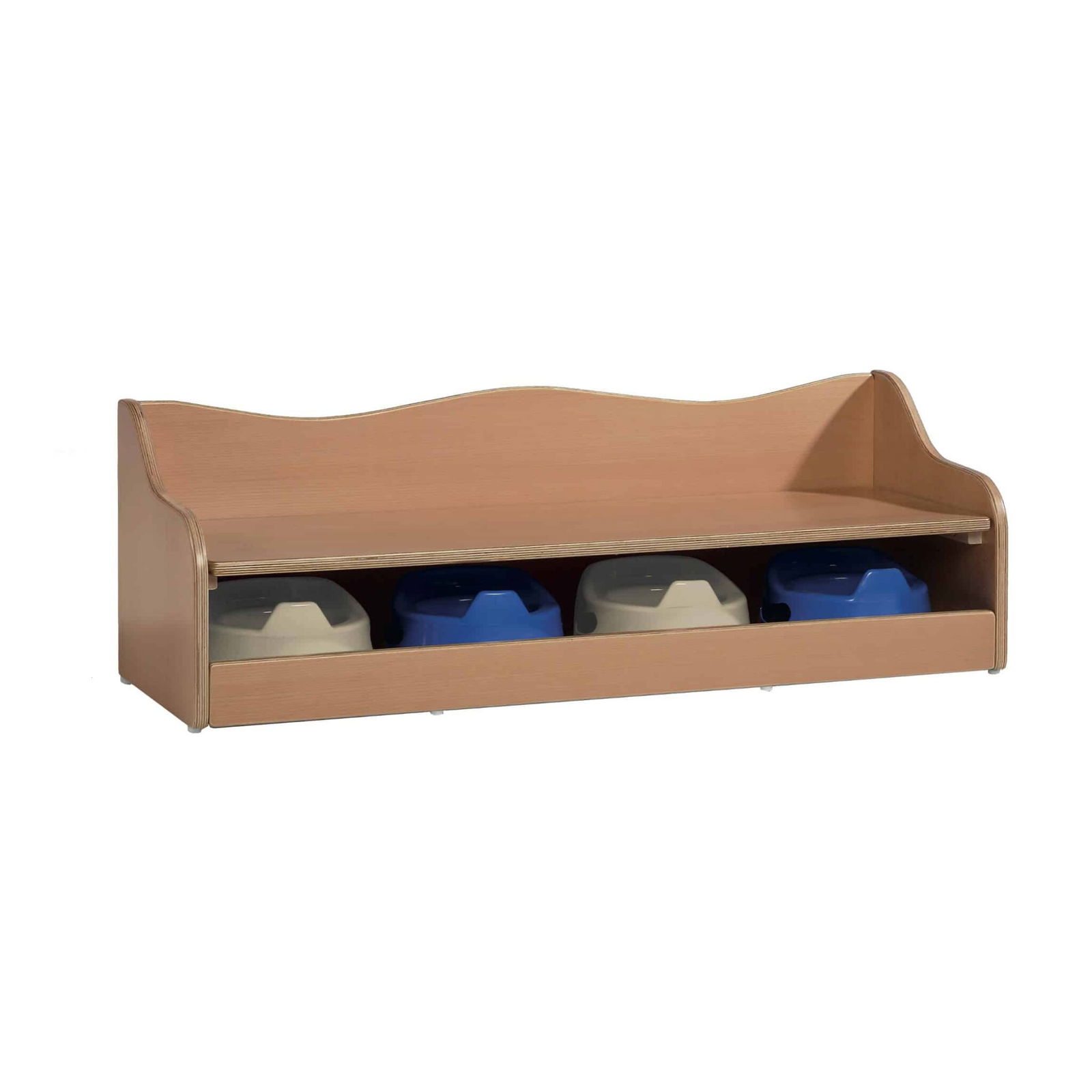 - Ordnung und Hygiene im Waschraum: Schluss mit herumstehenden Töpfchen! Diese Bank bietet vier fest definierte Plätze und sorgt so für eine aufgeräumte und strukturierte Umgebung. Nach der Benutzung verschwinden die Töpfchen diskret unter der geschlossenen Sitzfläche. Die glatten Oberflächen der Multiplexplatte sind zudem sehr leicht zu reinigen und zu desinfizieren, was zur Aufrechterhaltung hoher Hygienestandards beiträgt.