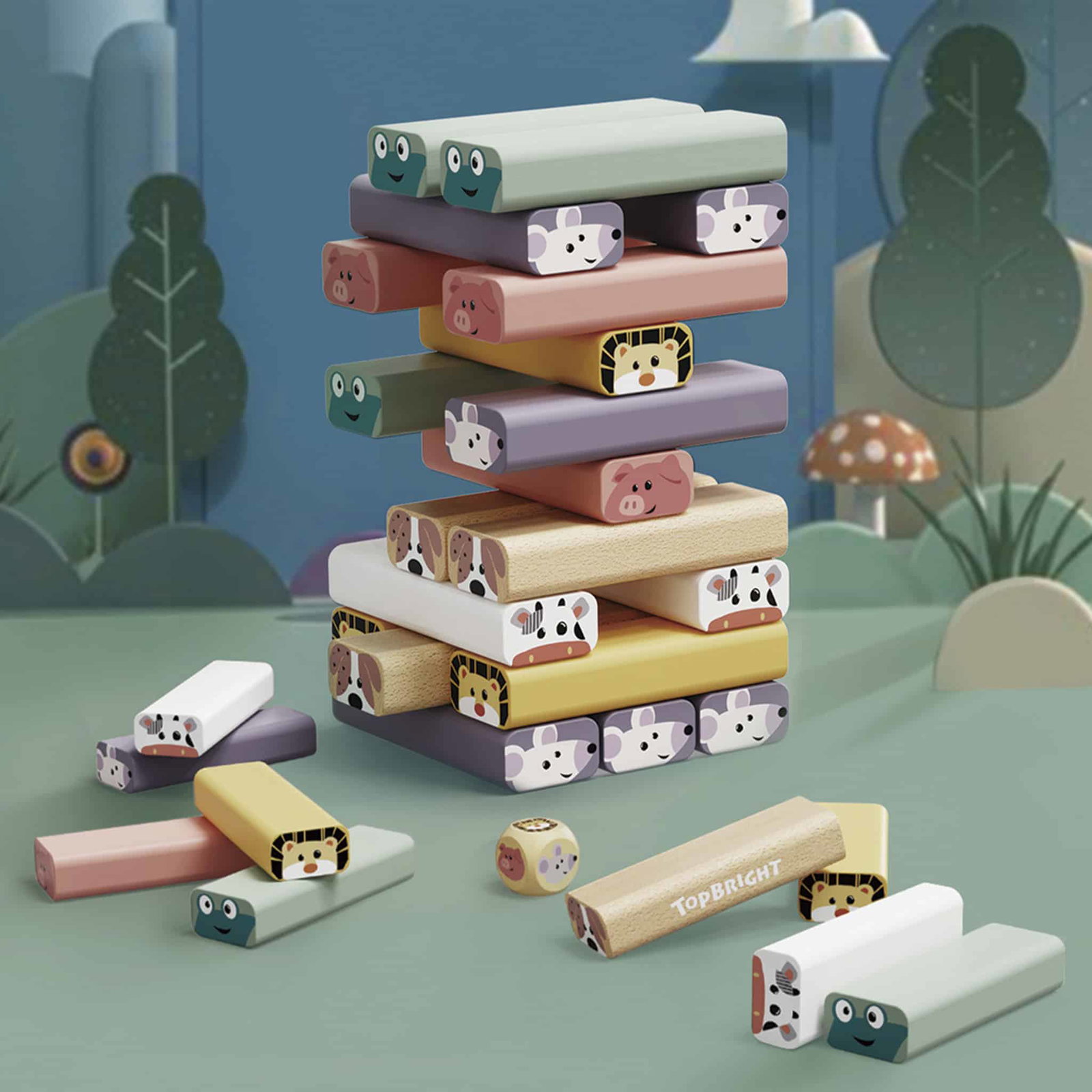 Das Spielkonzept des Wackelturms ist einfach und aufregend zugleich: Die Kinder würfeln oder ziehen nacheinander eine Karte mit einem Tiermotiv. Anschließend ziehen sie den passenden Holzklotz aus dem Turm und legen ihn darauf – natürlich nur, wenn der Turm nicht umfallen darf! Diese Herausforderung fördert nicht nur die Hand-Auge-Koordination, sondern auch die Geduld der Kinder. Jedes Mal, wenn die Bauklötze umfallen, wird das Gelächter nicht lange auf sich warten lassen!