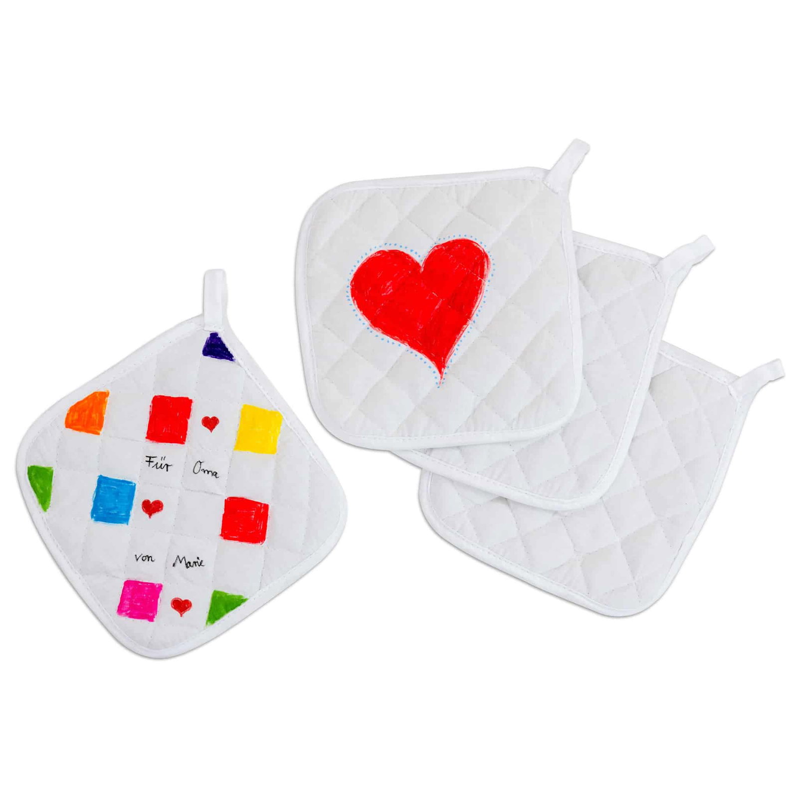 - Individuell gestalten: Kreieren Sie einzigartige Designs mit Textilfarben oder -markern und verwandeln Sie diese blanken Topflappen in bunte Küchenaccessoires oder dekorative Andenken.