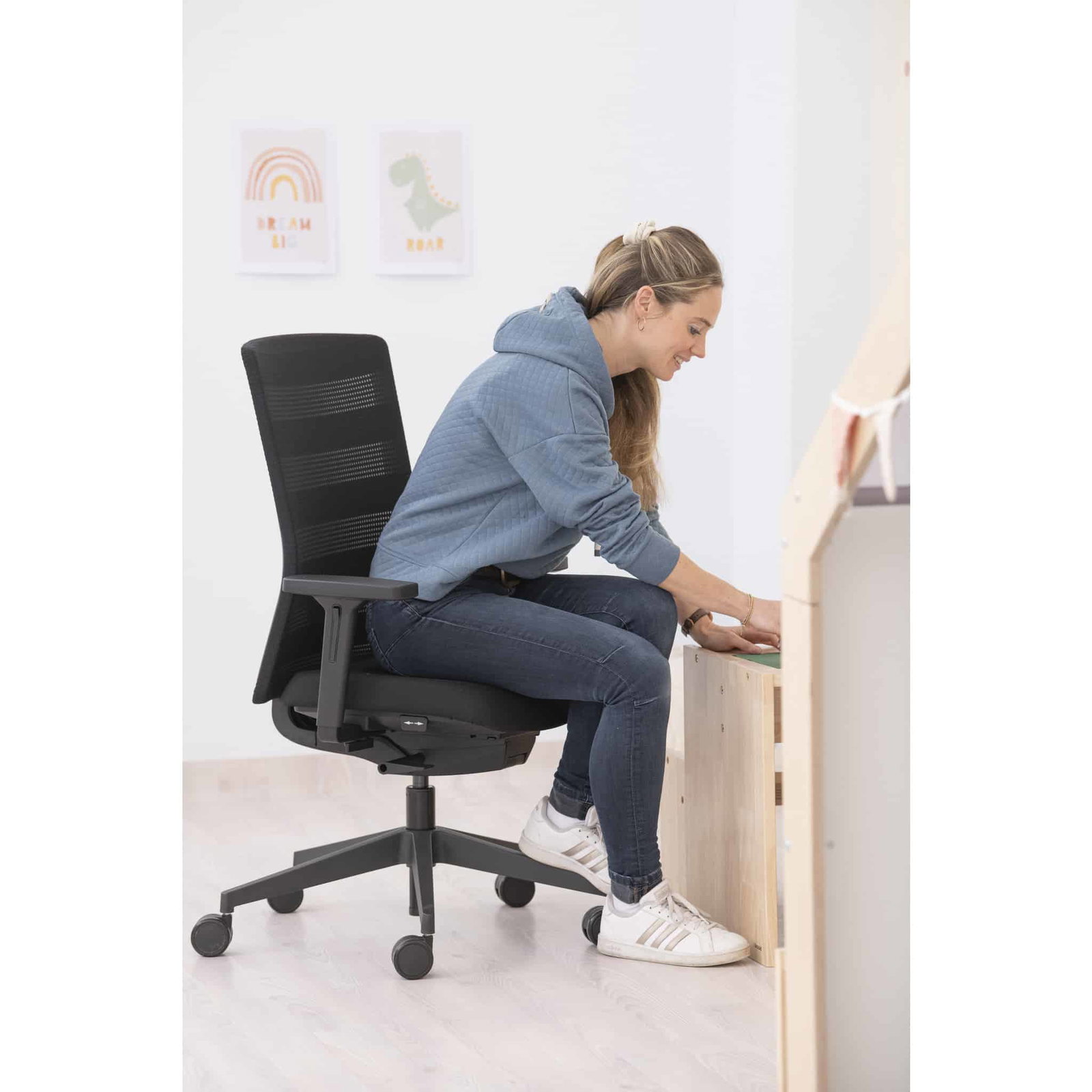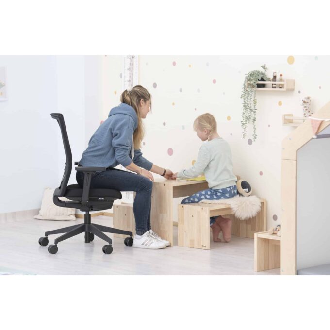 - Bewegungsfreiheit in jede Richtung: Das Sitzen wird zu einem aktiven Vorgang, der sowohl den Blutkreislauf aktiviert als auch die Konzentration und Leistungsfähigkeit steigert.