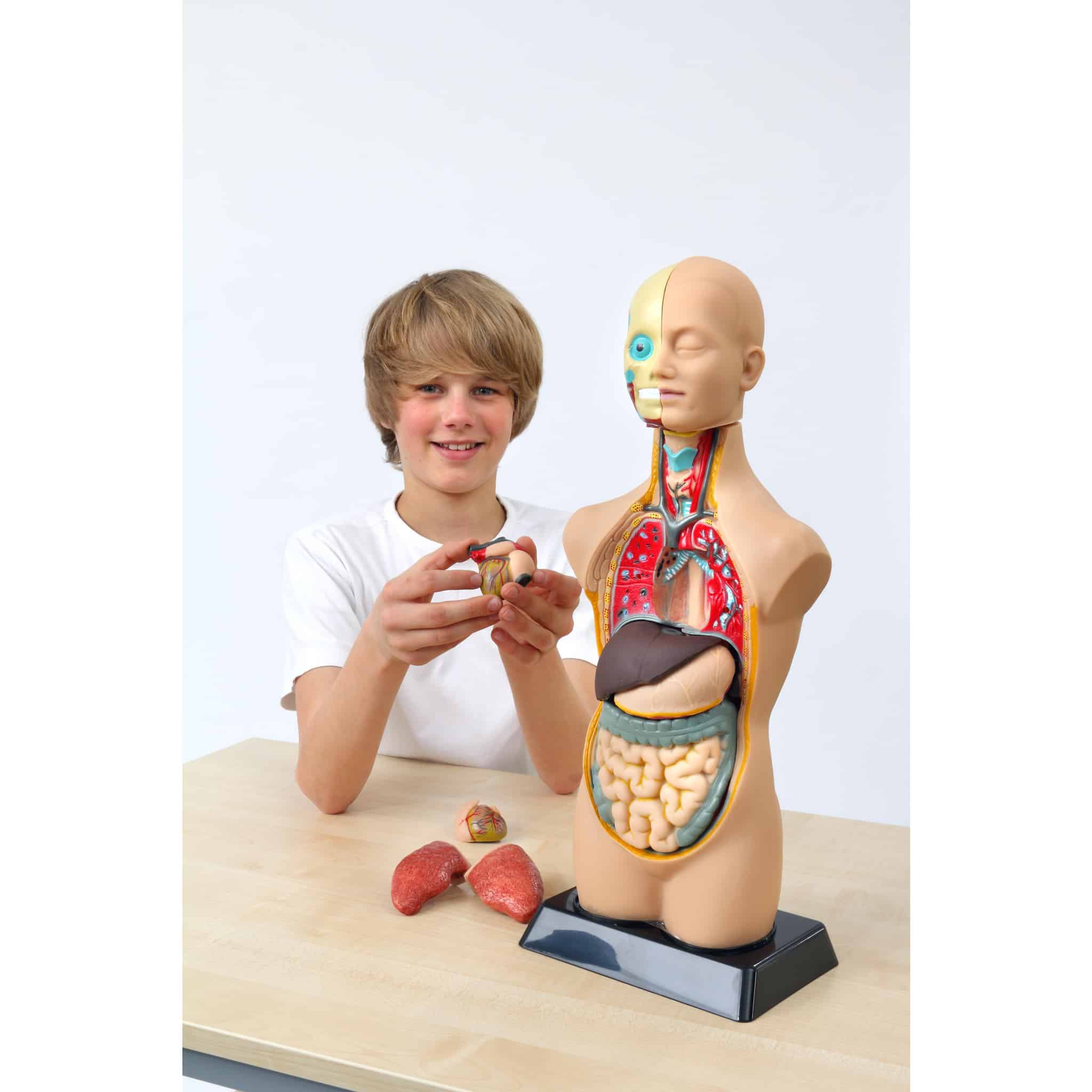 Das Modell ist in insgesamt 11 Teile zerlegbar, darunter der zweigeteilte Schädel sowie 8 weitere herausnehmbare Organe. So können die Lernenden nicht nur die sichtbaren Organe erlernen, sondern auch die darunter liegenden Strukturen erkunden und verstehen. Anfassen und Ein- und Ausbauen sind hierbei Schlüssel zu einem effektiven Lernprozess.