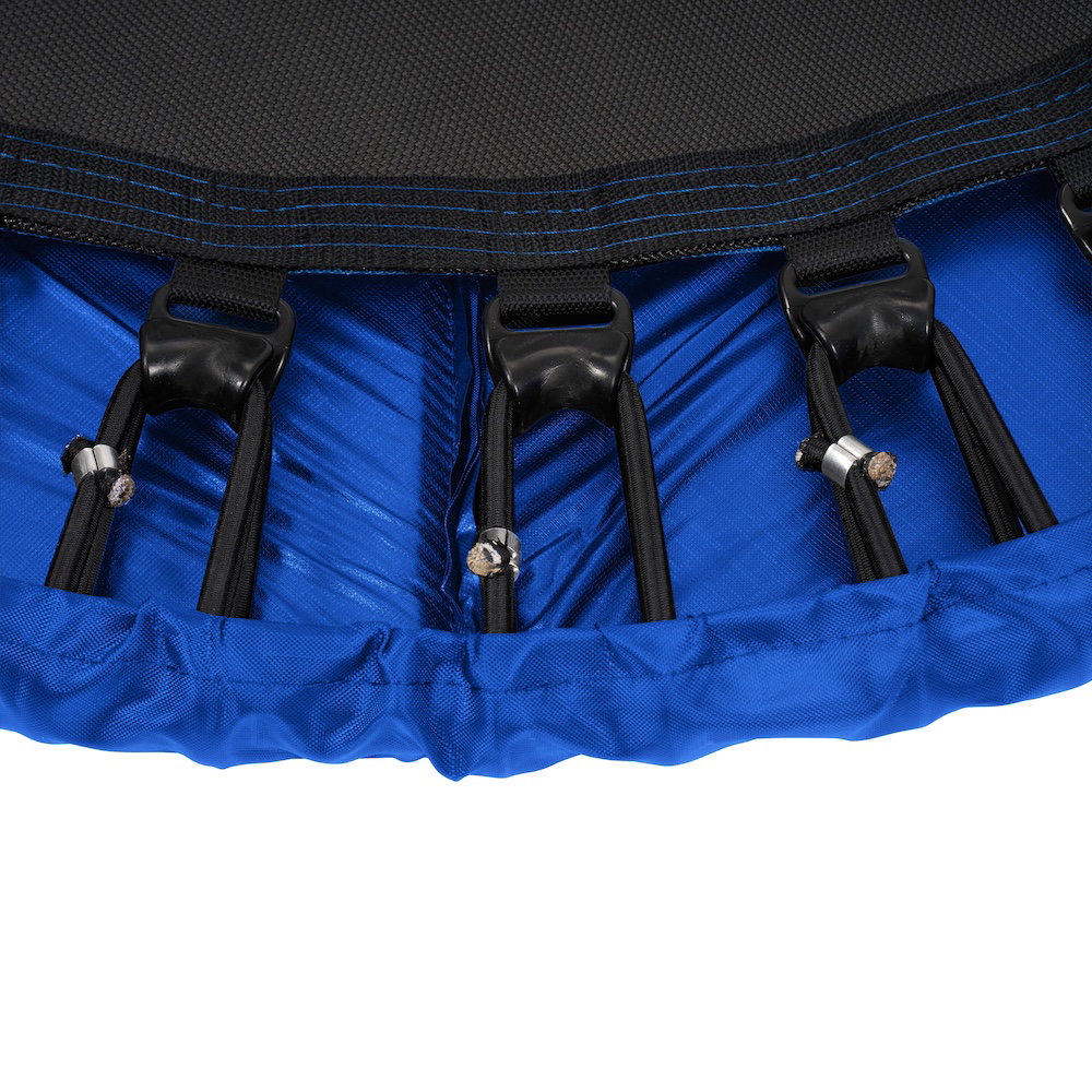 Ein besonderes Qualitätsmerkmal dieses Modells ist die durchdachte Konstruktion der Federung. Anstelle herkömmlicher harter Stahlfedern verfügt das Trampolin über eine clevere Einzelaufhängung mit acht Millimeter dicken Gummiseilen. Diese innovative Technik sorgt für ein weiches Rebound-Verhalten, das Ihre Gelenke spürbar schont. Zudem ermöglicht die Gummiseilfederung ein nahezu geräuschloses Training. Sie stören weder Nachbarn noch andere Trainierende im Studio. Jedes einzelne Gummiseil lässt sich extrem weit dehnen und erweist sich selbst bei sehr intensiver Nutzung als äußerst langlebig und widerstandsfähig. Sollte dennoch einmal ein Verschleiß auftreten, tauschen Sie die Seile dank der praktischen Einzelaufhängung völlig unkompliziert und schnell aus. Die Sprungmatte selbst wird von robusten Kunststoffhaken sicher an Ort und Stelle gehalten.