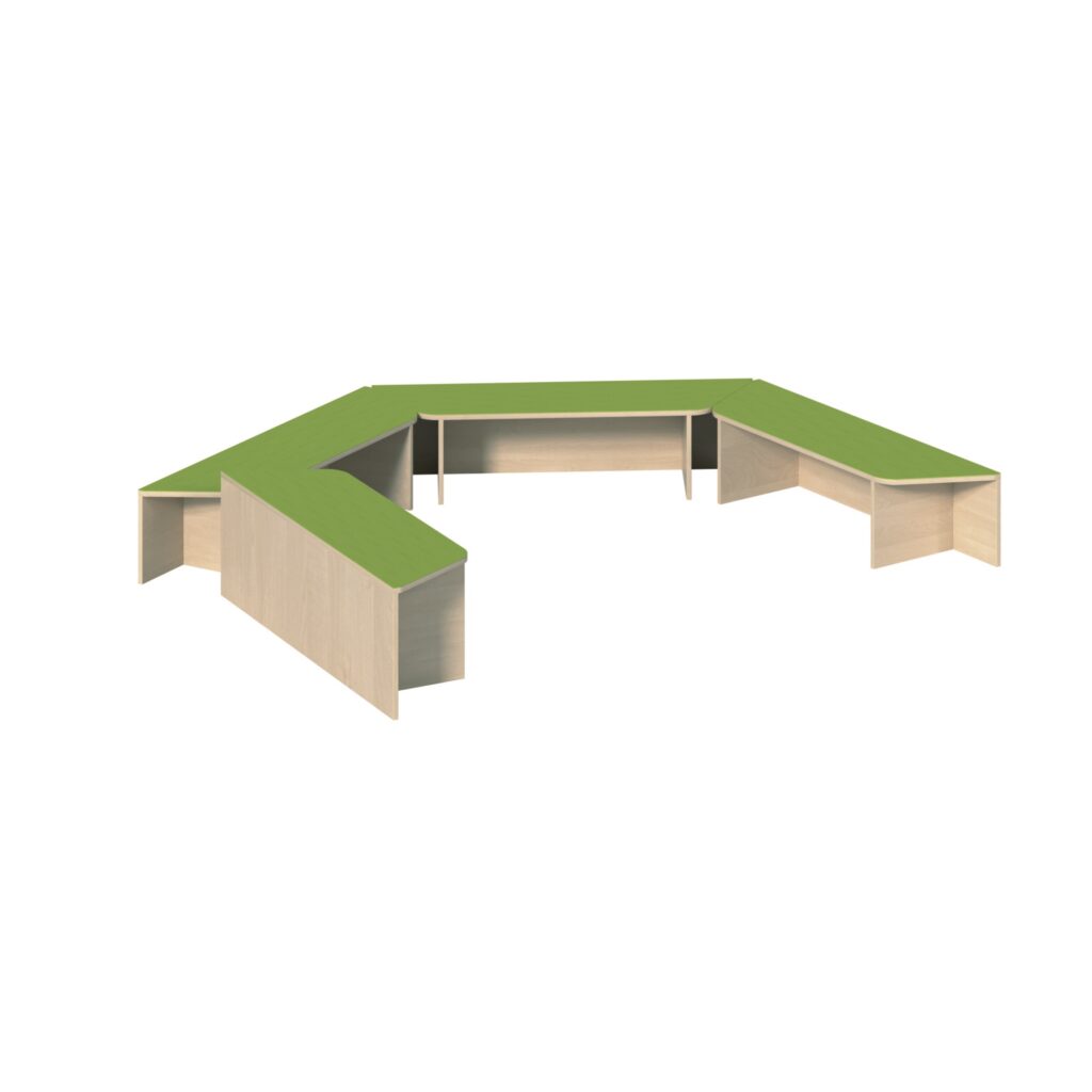 Die Anlage setzt sich aus drei Trapezpodesten P14-135 und einem höheren Trapezpodest P14-146 zusammen. Diese Anordnung schafft eine dynamische und abwechslungsreiche Umgebung, die Kinder zum Klettern, Spielen und Entspannen einlädt. Ob als Plattform für Kreativität oder als Ort zum Ruhe finden – die Trapezpodestanlage fördert die motorische Entwicklung und die Kreativität Ihrer Schützlinge.
