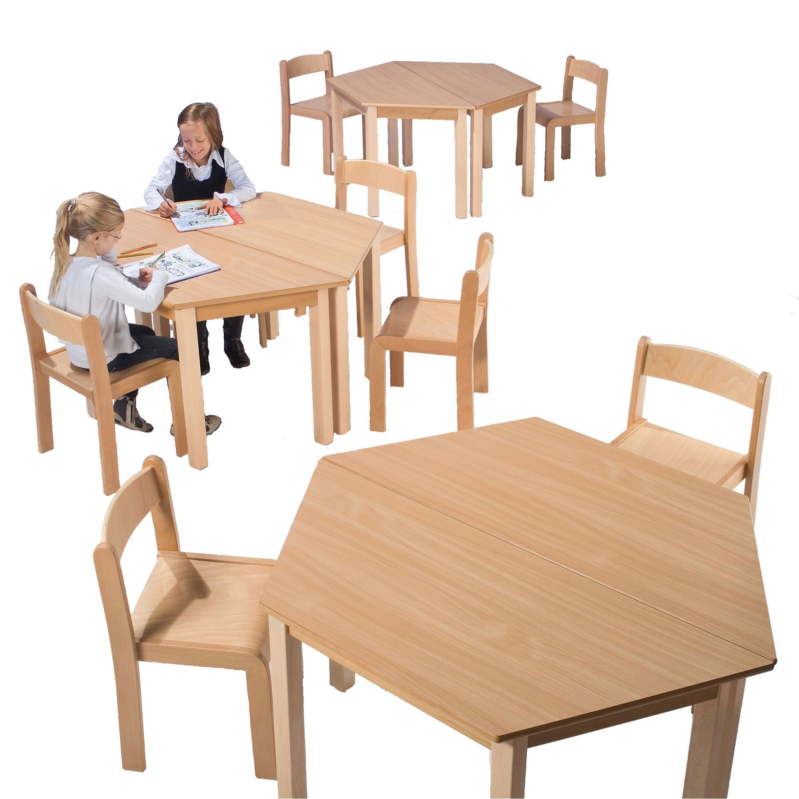 Mit unseren Trapeztischen schaffen Sie ein anregendes Umfeld für kreatives und gemeinschaftliches Lernen. Sie können frei im Raum platziert oder zu größeren Einheiten kombiniert werden, was sie besonders für Gruppenaktivitäten und den offenen Unterricht geeignet macht. Jeder Tisch ist ein Raum für Ideen und Entwicklungen, der mit den Kindern wächst und sich ihren Bedürfnissen anpasst.