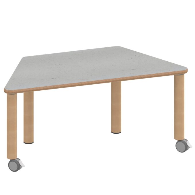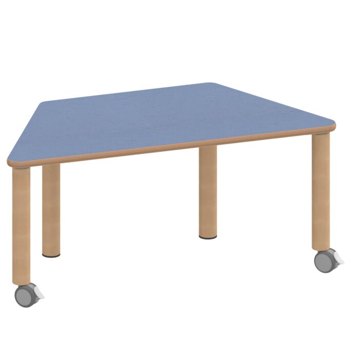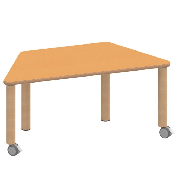 Der Trapeztisch ZALOTTI mit Linoleum-Belag und fahrbaren Massivholzbeinen setzt neue Maßstäbe für moderne Krippen- und Kindergartenräume durch die geniale Kombination aus geometrischer Trapezform und cleverer Mobilität. Diese außergewöhnliche zargenlose Tischkonstruktion mit 2,5 mm starkem, geräuschdämmendem Linoleum-Belag und robusten Buche-Massivholzbeinen schafft völlig neue Dimensionen für flexible Gruppenarbeit und spontane Raumgestaltung. Die besondere Trapezform in zwei verfügbaren Größen (120×60 cm oder 140×70 cm) und zwei integrierten Rollen ermöglicht müheloses Verschieben für spontane Raumrekonfiguration bei gleichzeitig komfortablem Arbeitsplatz für verschiedene Gruppengrößen. Die zargenlose Bauweise bietet ungehinderte Beinfreiheit für alle Nutzer – auch für Rollstuhlfahrer. Mit acht verfügbaren Höhen von 25 bis 76 cm wächst dieser „Made in Germany“ Qualitätstisch flexibel mit den Kindern mit und schafft durch seine natürliche Holzoptik eine warme, einladende mobile Arbeitsatmosphäre.