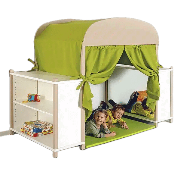 Jedes Kind braucht einen eigenen, besonderen Ort – eine kleine Welt nur für sich. Unsere Traumhöhle mit ihrem sanft geschwungenen Bogendach ist genau das: eine Einladung zum Träumen, ein sicherer Hafen zum Entspannen und eine Bühne für fantasievolle Abenteuer. Dieses einzigartige Raum-im-Raum-Konzept kombiniert auf geniale Weise eine gemütliche Kuschelhöhle mit praktischem Stauraum. Flankiert von zwei stabilen Stollenregalen, bietet die Traumhöhle nicht nur Geborgenheit, sondern auch Platz für Bücher, Kissen und die liebsten Spielsachen. Ein integrierter Spiegel lädt zur Selbsterkundung ein und macht diesen Ort zu einem pädagogisch wertvollen Zentrum im Kita-Alltag oder im Kinderzimmer.