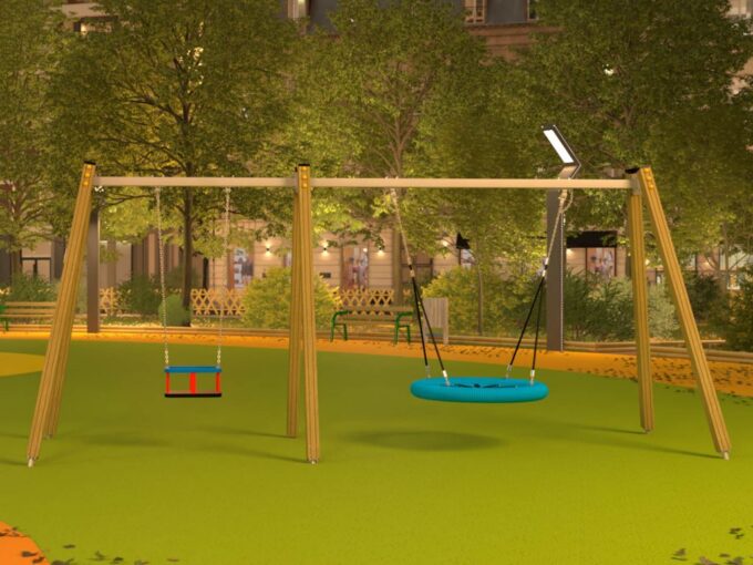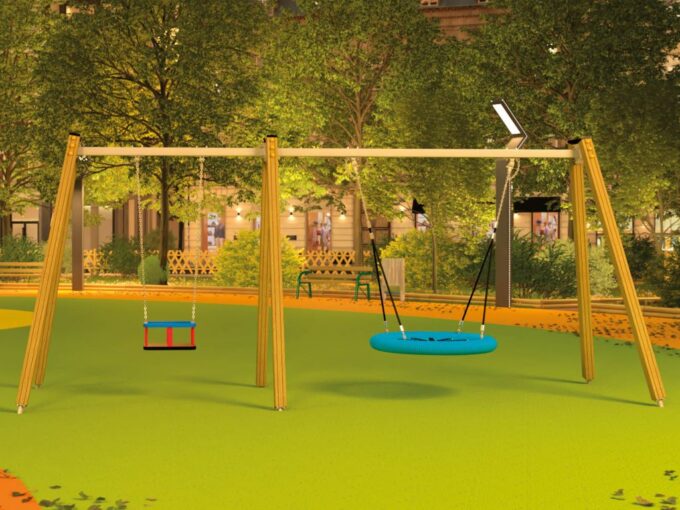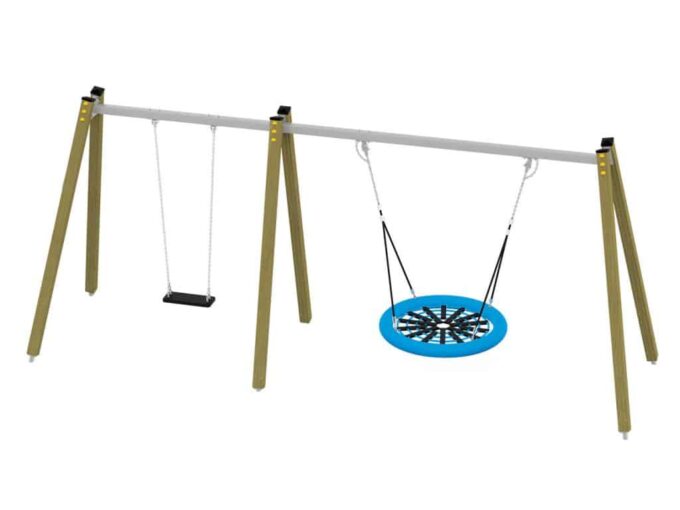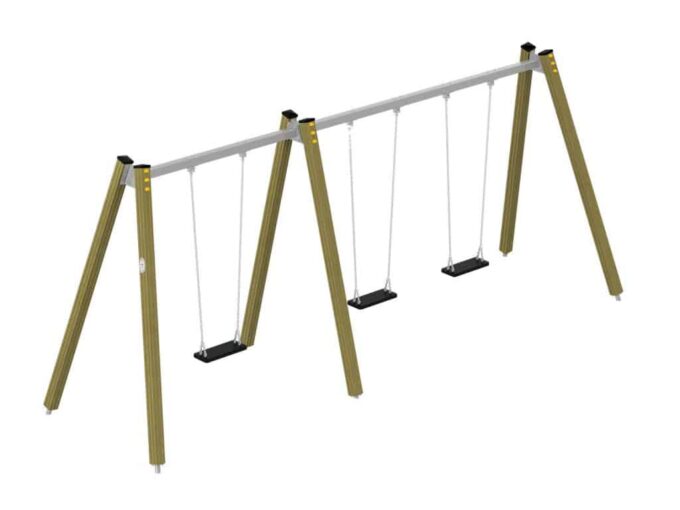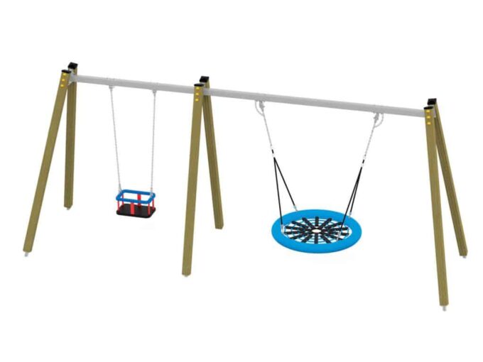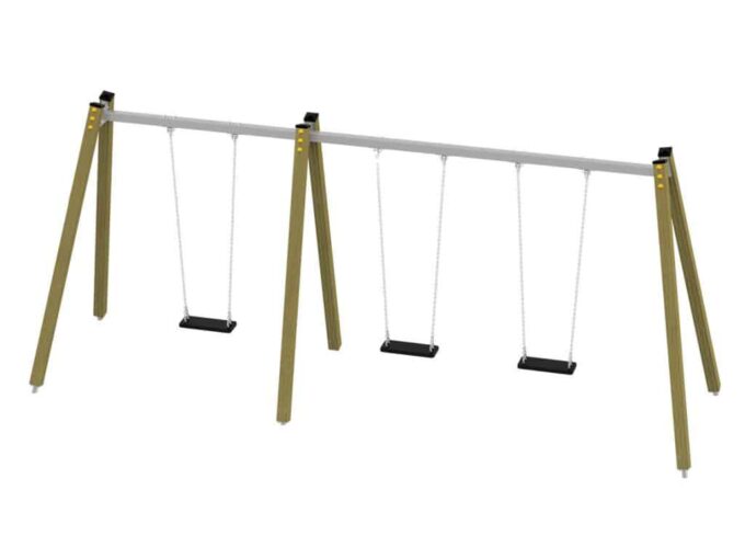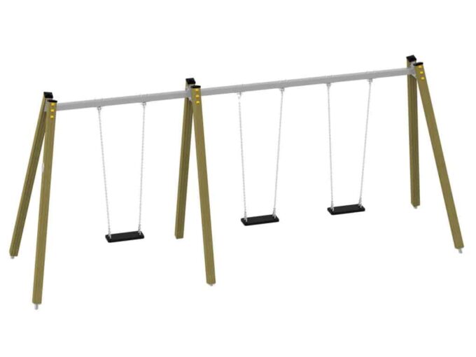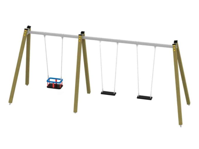Eine traditionelle Schaukel aus hochwertigsten Materialien, entworfen für drei Kinder. Sitze – Kann durch einen Korbsitz und einen Korb mit Kettenschloss ersetzt werden. Bei Doppelschaukeln kann ein Vogelnestsitz installiert werden.