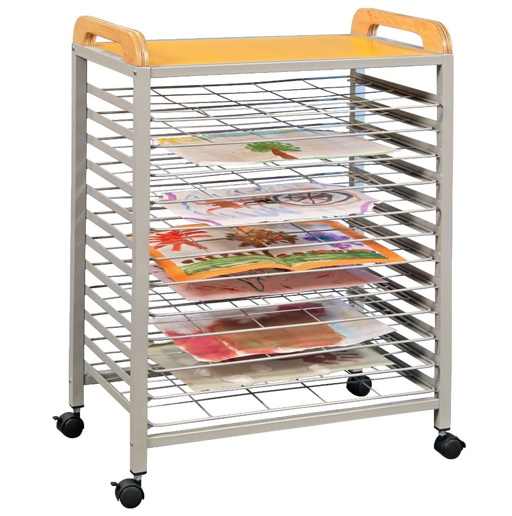 In dem Trockenwagen lassen sich die Kunstwerke der Kinder ordentlich zum Trocknen aufbewahren. Der Trockenwagen steht auf vier arretierbaren Rollen.
