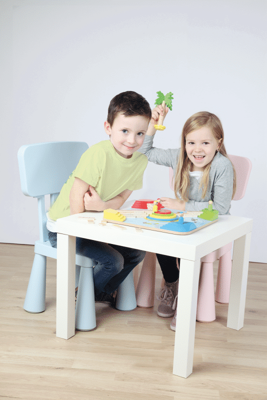 Das Tropicano Set kommt in einer geräumigen Boxgröße von 38,5 x 38,5 x 8 cm und besteht aus robustem Sperr- und Massivholz sowie MDF. Die Materialien sind langlebig und kindgerecht – ideal für unbeschwerte Spielstunden.