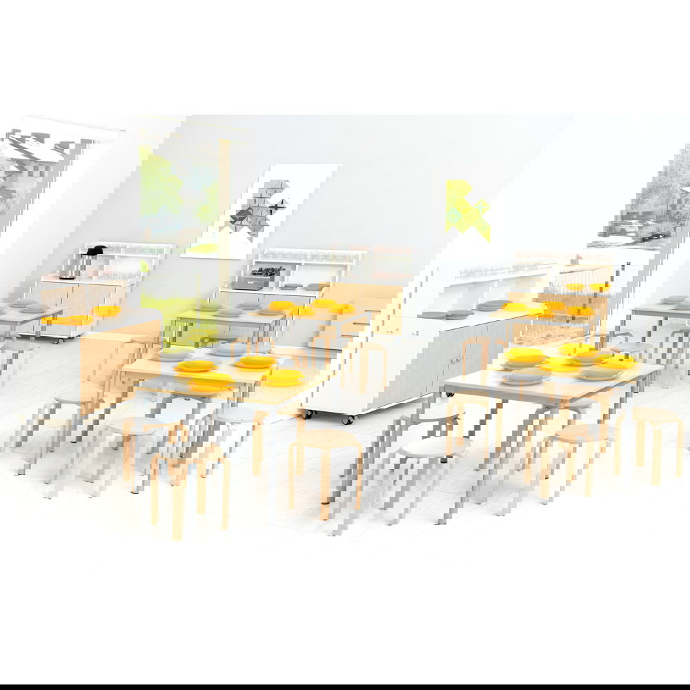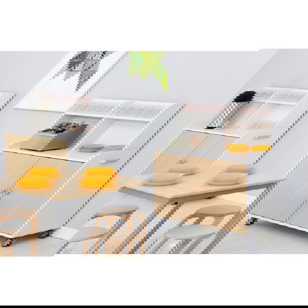 In belebten Umgebungen wie Kindergärten, Schulen oder Gemeinschaftsräumen ist eine gute Organisation unerlässlich. Mobile Möbel wie das Küchenbuffet auf Rollen (Artikel 092741, 092742) bieten Flexibilität, doch oft fehlt eine Möglichkeit, den Inhalt ordentlich und blickdicht zu verstauen. Unser passgenaues Türenpaar ist die ideale Ergänzung, um das offene Buffet in einen geschlossenen, aufgeräumten Schrank zu verwandeln. Es schützt den Inhalt vor Staub und neugierigen Blicken und verleiht dem Möbelstück gleichzeitig eine ruhige, professionelle und geschlossene Optik.