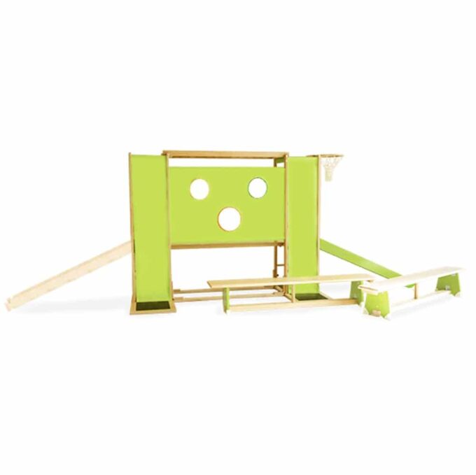 Ein vielseitiges Klettergerät. Mit wenigen Handgriffen wird das Klettergerät als Puppentheater oder als Wurfwand einsetzbar. Mattensatz auf Anfrage lieferbar.