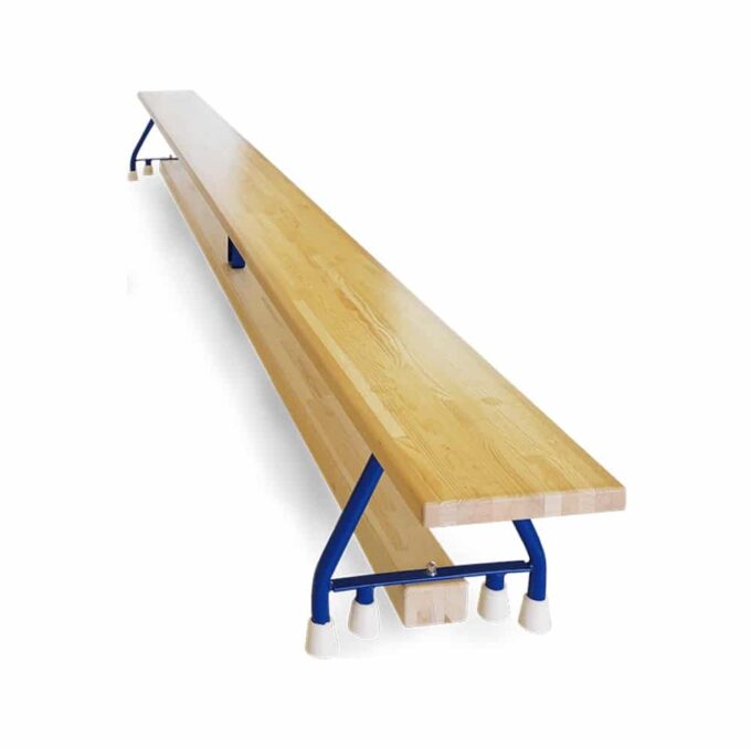 Turnbänke – Breite Bänke sind ideal für vielfältige Turnübungen. Die Sitzfläche besteht (soweit nicht anders angegeben) aus Kiefer, die Füße aus Multiplex. An der Plattenunterseite befindet sich eine Leiste, welche das Einhängen in Sprungkästen und Sprossenwänden ermöglicht. An den Turnbankfüßen befinden sich rutschhemmende Gummischoner. Als Zubehör sind Transportwagen, Rollen und Einhängeleiste mit Sicherheitsgurt lieferbar.