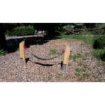 - 2 Robinien Palisaden als Standpfosten, je ca. 150 cm lang, Ø 14-16cm, mit vormontierten Sicherheitslagern und – bei Variante mit Stahllaschen – mit vormontierten Stahllaschen
