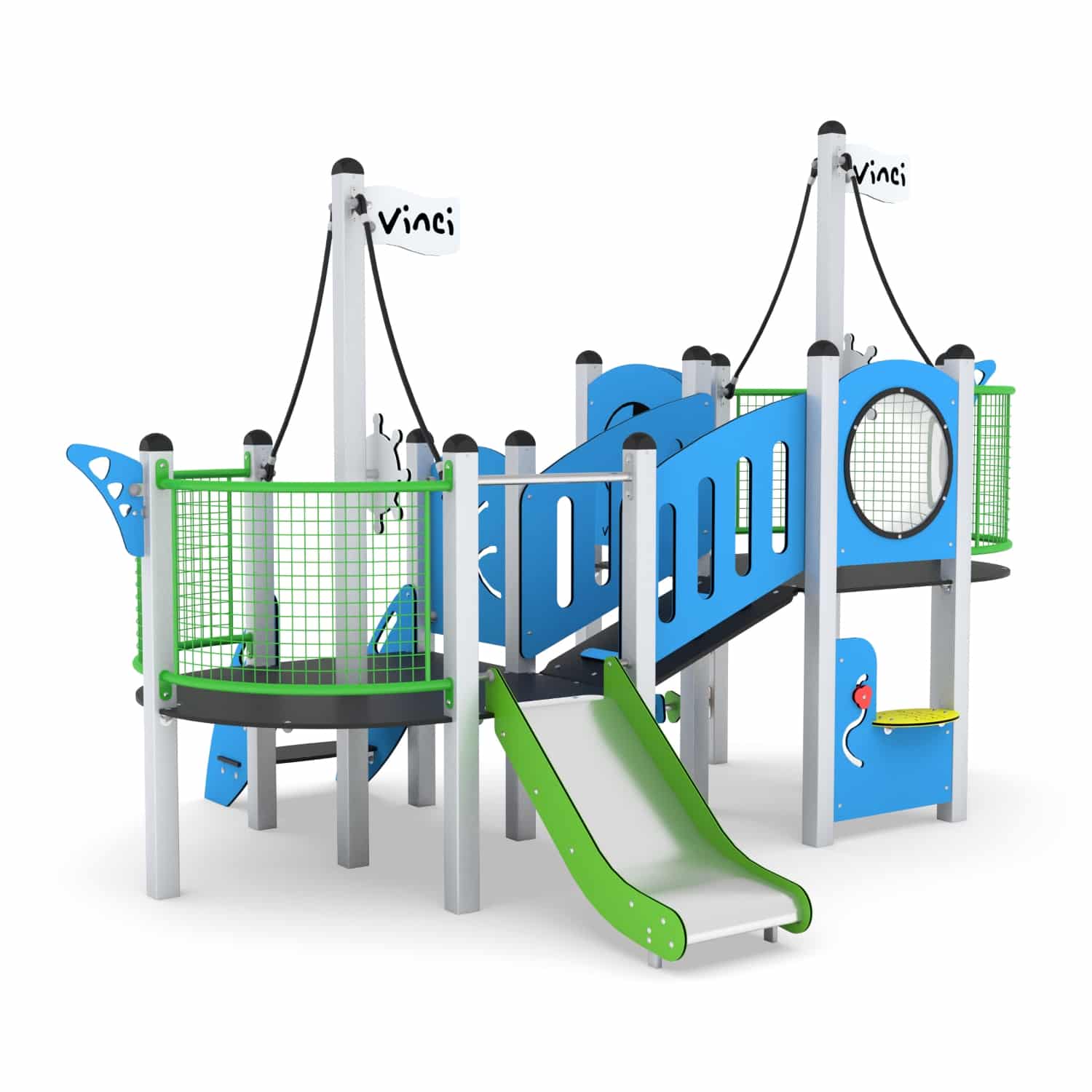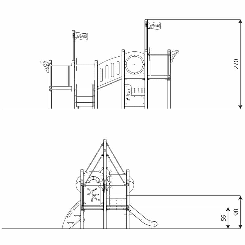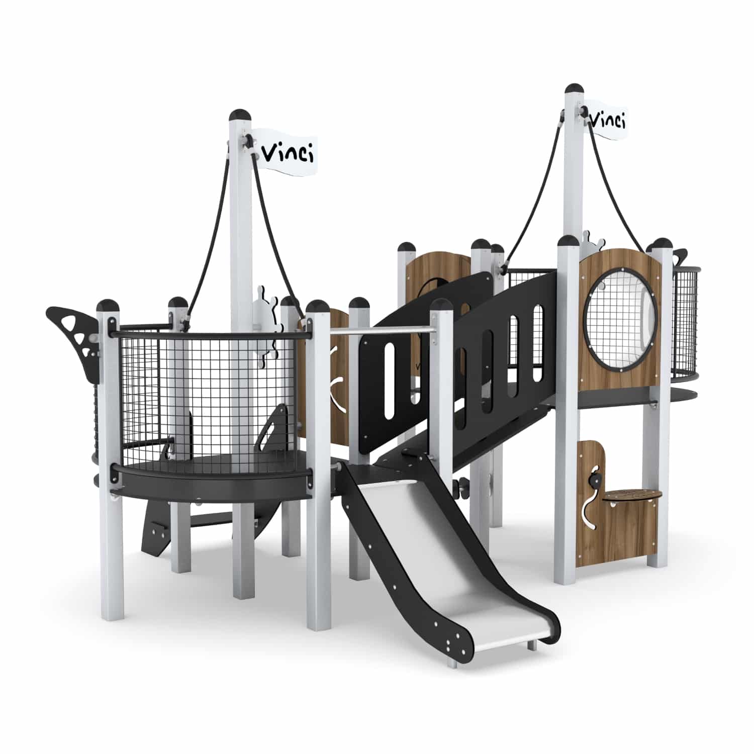 - Plattformen und Stufen aus strapazierfähigem, rutschfestem und wasserdichtem Sperrholz oder HPL-Platte, Seitenwände aus strapazierfähiger HDPE- oder HPL-Platte, witterungsbeständig, Rutschen aus Edelstahl mit langlebigen HDPE- oder HPL-Seitenplatten,