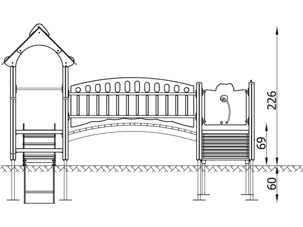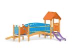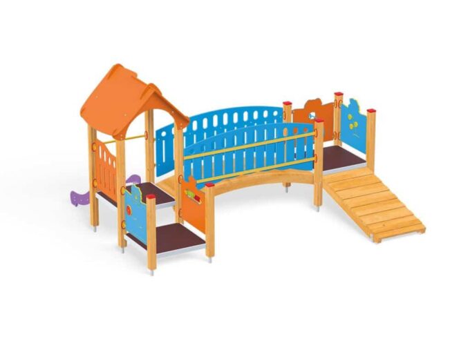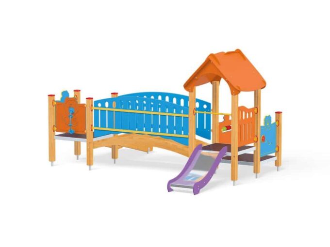 Ein kleines Set für Kinder. Die einfach zu überwindende Brücke mit Vollbarriere, 3 quadratischen Plattformen und einer niedrigen Rutsche gibt auch Babys, die gerade das Laufen gelernt haben, ein sicheres Spielgefühl. Ein weiterer Vorteil dieses Sets sind Manipulationen: Bär, Löwe und Abakus, die die Entwicklung von Kindern unterstützen, ihnen helfen, ihre Fähigkeiten und Motorik beim Spielen zu verbessern.