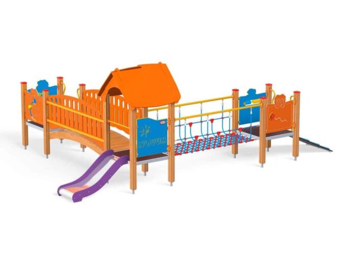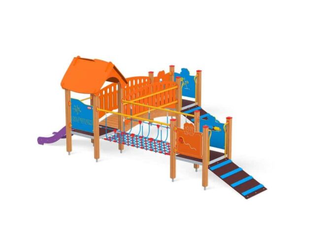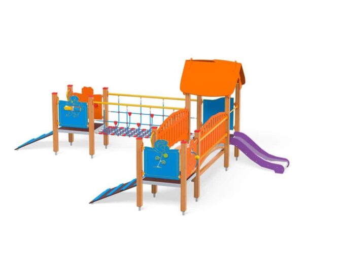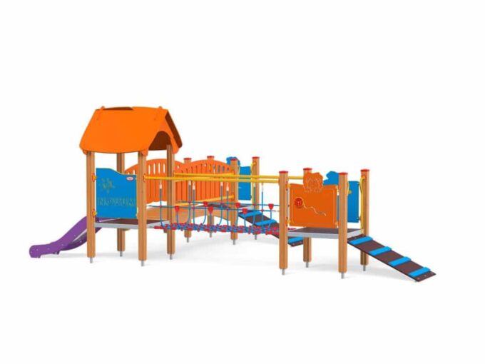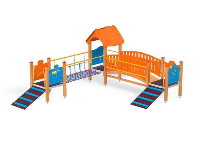 Ein kleines Set für Kinder. Die einfach zu überwindende große Brücke, 3 quadratischen Plattformen mit mehreren Aufstiegen und einer niedrigen Rutsche gibt auch Babys, die gerade das Laufen gelernt haben, ein sicheres Spielgefühl. Ein weiterer Vorteil dieses Sets sind Manipulationen: Bär, Löwe und Abakus, die die Entwicklung von Kindern unterstützen, ihnen helfen, ihre Fähigkeiten und Motorik beim Spielen zu verbessern.