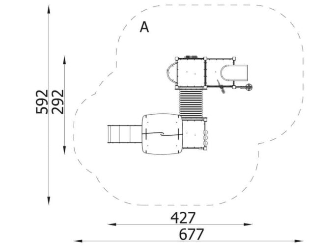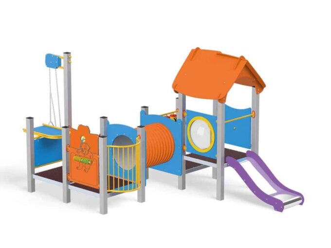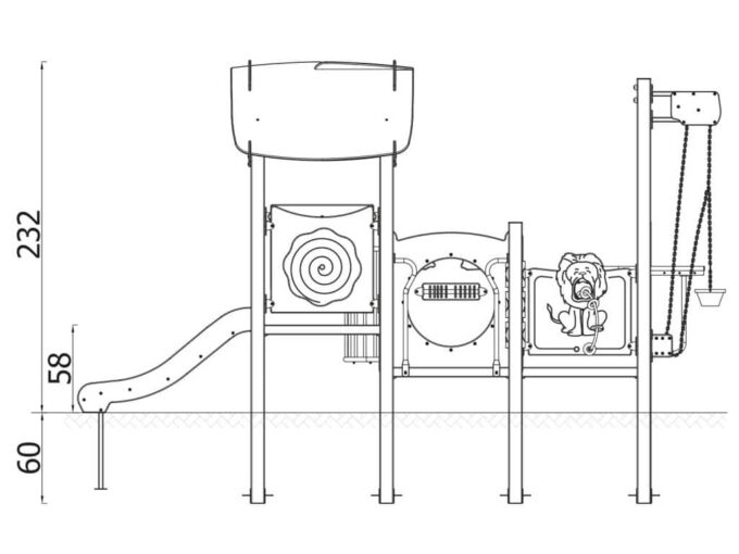 - Material: Tragpfosten aus Vierkantstahlprofilen mit Kreuz 9x9xcm, direkt im Boden befestigt. Rutschfeste Plattformen. Dächer, Sicherheitselemente und Paneele bestehen aus HDPE-Platten (hochfestes Polyethylen) mit Musterzuschnitten. Gleitfläche aus säurebeständigem Edelstahlblech. Seile aus Polypropylen mit Stahleinlage, Stärke 16-18 mm, vandalismus- und UV-beständig. Alle Beschläge und Anschlüsse sind witterungs- und UV-beständig. Holzelemente werden geölt oder mit einer Farblasur überzogen. Stahlelemente sind mit einer Zinkschicht und Pulverlackbeschichtung gegen Korrosion geschützt.