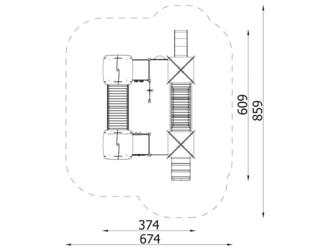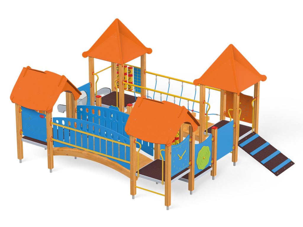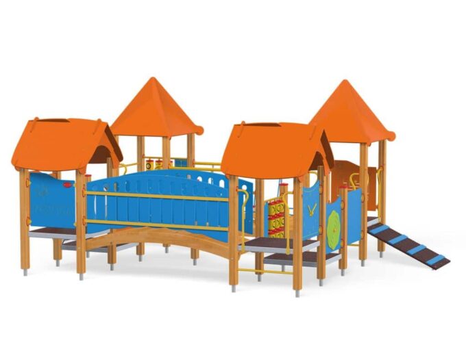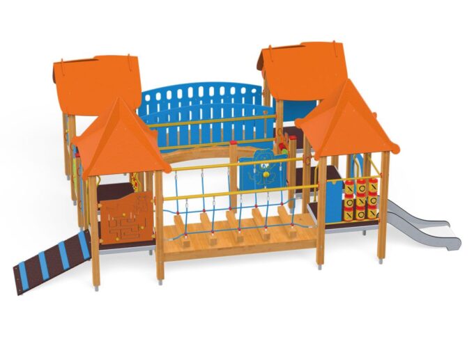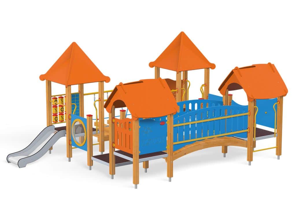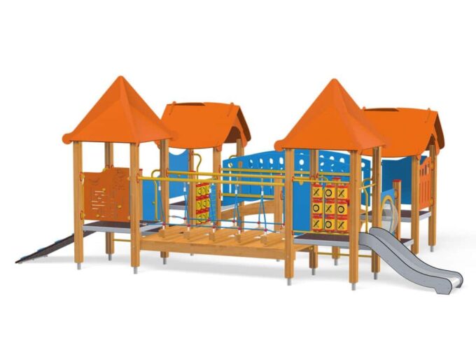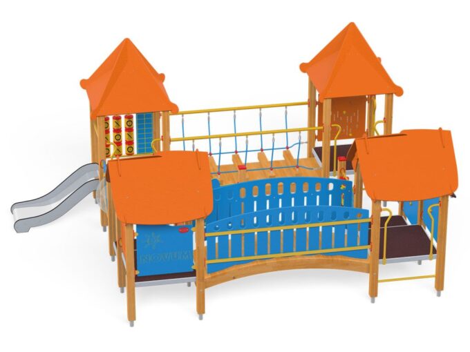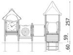 - Material: Die Tragpfosten sind quadratisch und haben einen Querschnitt von 9×9 cm. Sie bestehen aus Brettschichtholz und werden 10 cm über dem Boden mit Metallankern befestigt. Rutschfeste Plattformen. Dächer, Sicherheitselemente und Paneele werden aus HDPE-Platten (High Durable Polyethylen) mit Musterzuschnitten hergestellt. Gleitfläche aus säurebeständigem Edelstahlblech. Seile aus Polypropylen mit Stahlkern, Stärke 16-18 mm, vandalismus- und UV-beständig. Alle Fittings und Anschlüsse sind witterungs- und UV-beständig. Holzelemente werden geölt oder mit einer Farblasur überzogen. Stahlelemente sind mit Zinkschicht und Pulverlackierung gegen Korrosion geschützt.