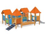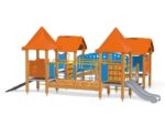 Spielanlage mit 4 Spieltürmen, Wackelbrücke, Brücke, mehreren Rutschen und vielen Motorik-Elementen.