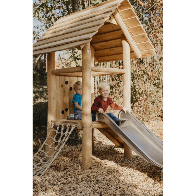 U3-Zwergenhausenturm mit Anbauten aus Robinien-Holz: Kompaktes „Leucht‐Türmchen“: Unser U3‐Zwergenhausen- Spielturm ist das Highlight auf jedem U3‐Spielplatz. Besonders die bunten Gucklöcher im Geländerelement haben magische Anziehungskraft. Sie motivieren Kinder, den Turm über das Kletternetz oder die Aufstiegsrampe zu erobern. Oben angekommen, genießen die einen den Ausblick, die anderen die Rutschpartie nach unten.