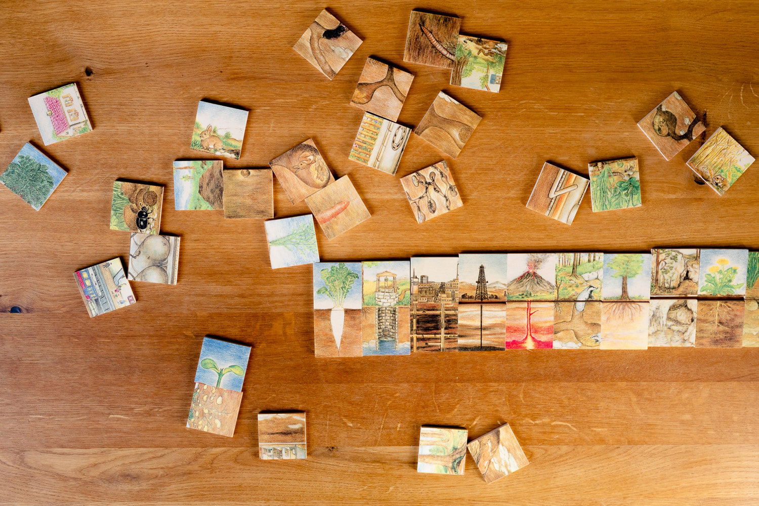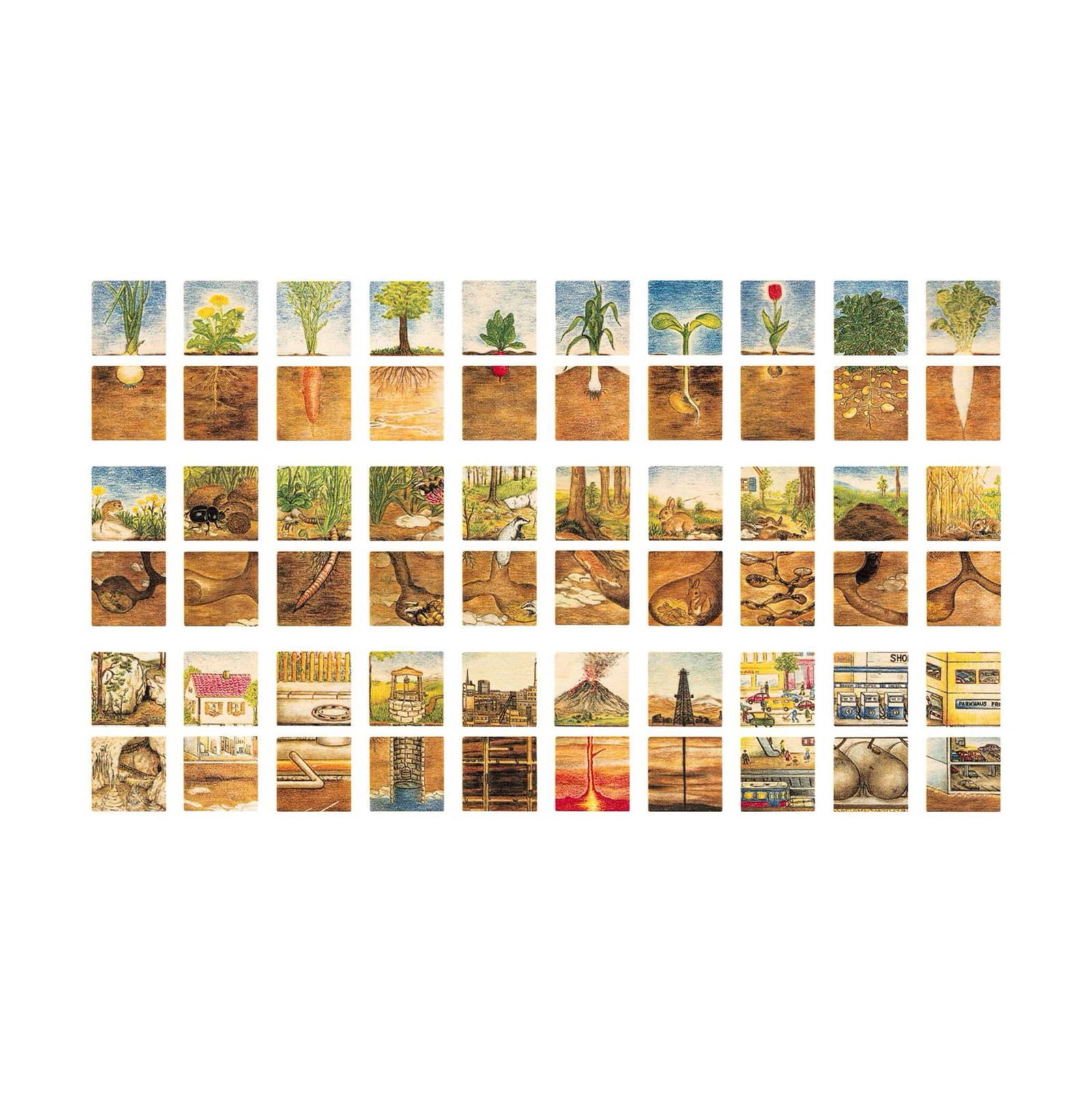 - Einblicke in die unsichtbare Welt: Die zweiteiligen Motive zeigen anschaulich, was sich normalerweise verborgen unter der Erde befindet – von Wurzelsystemen bis hin zu technischen Installationen. Kinder erweitern spielerisch ihr Verständnis der Umwelt.
