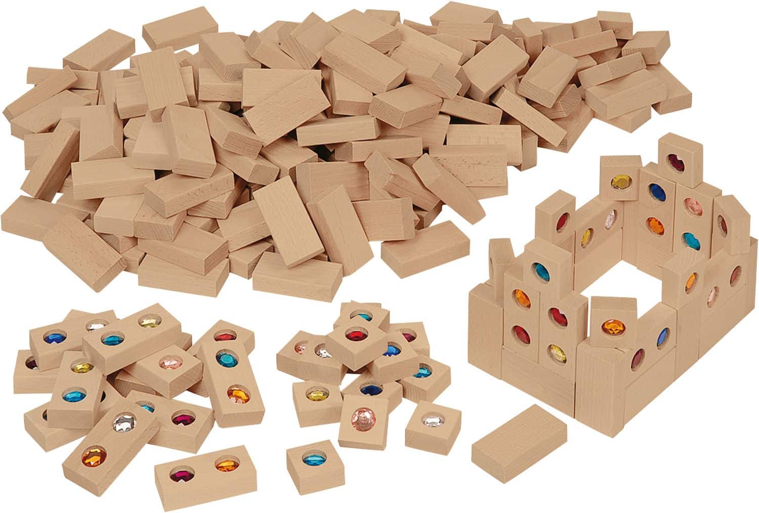 - Vielfalt der Formen: Das Set enthält 20 Quader (Maße: 6,66 x 3,33 x 1,66 cm) und 20 halbe Quader mit wunderschönen, eingesetzten Juwelen (Durchmesser: 1,8 cm). Diese verschiedenen Formen und Designs laden die Kinder ein, fantastische Bauwerke zu errichten und ihre eigenen Ideen zu verwirklichen.