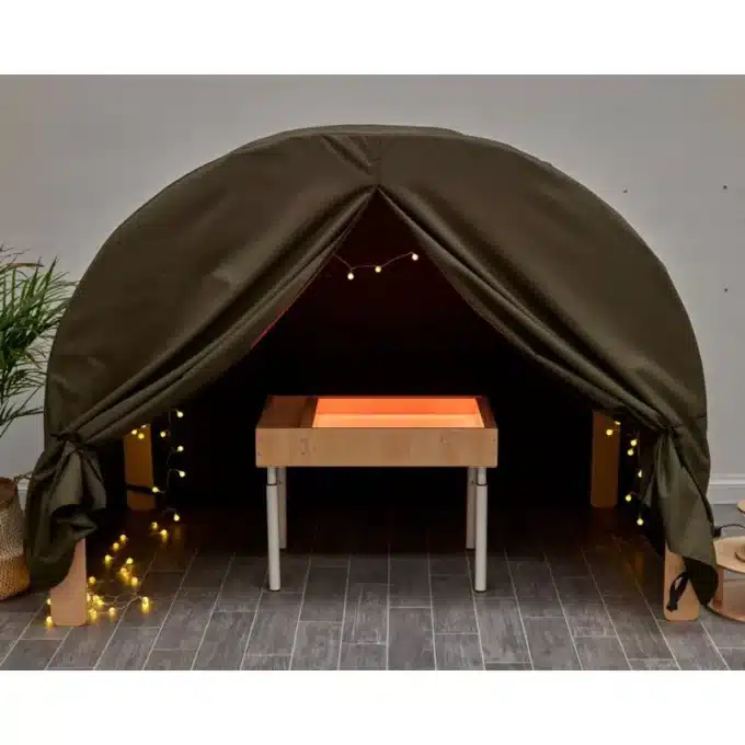 Der lichtundurchlässige Stoff schafft einen dunklen, reizarmen Raum, der ideal für die sensorische Förderung ist. Kombinieren Sie die Höhle mit Leuchttischen, Lichterketten oder fluoreszierenden Materialien, um faszinierende visuelle Effekte zu erzeugen. Die abgeschirmte Atmosphäre hilft Kindern, sich auf einzelne Sinnesreize zu konzentrieren und ihre Wahrnehmung zu schulen. - Schafft einen sicheren Ruhe- und Rückzugsort