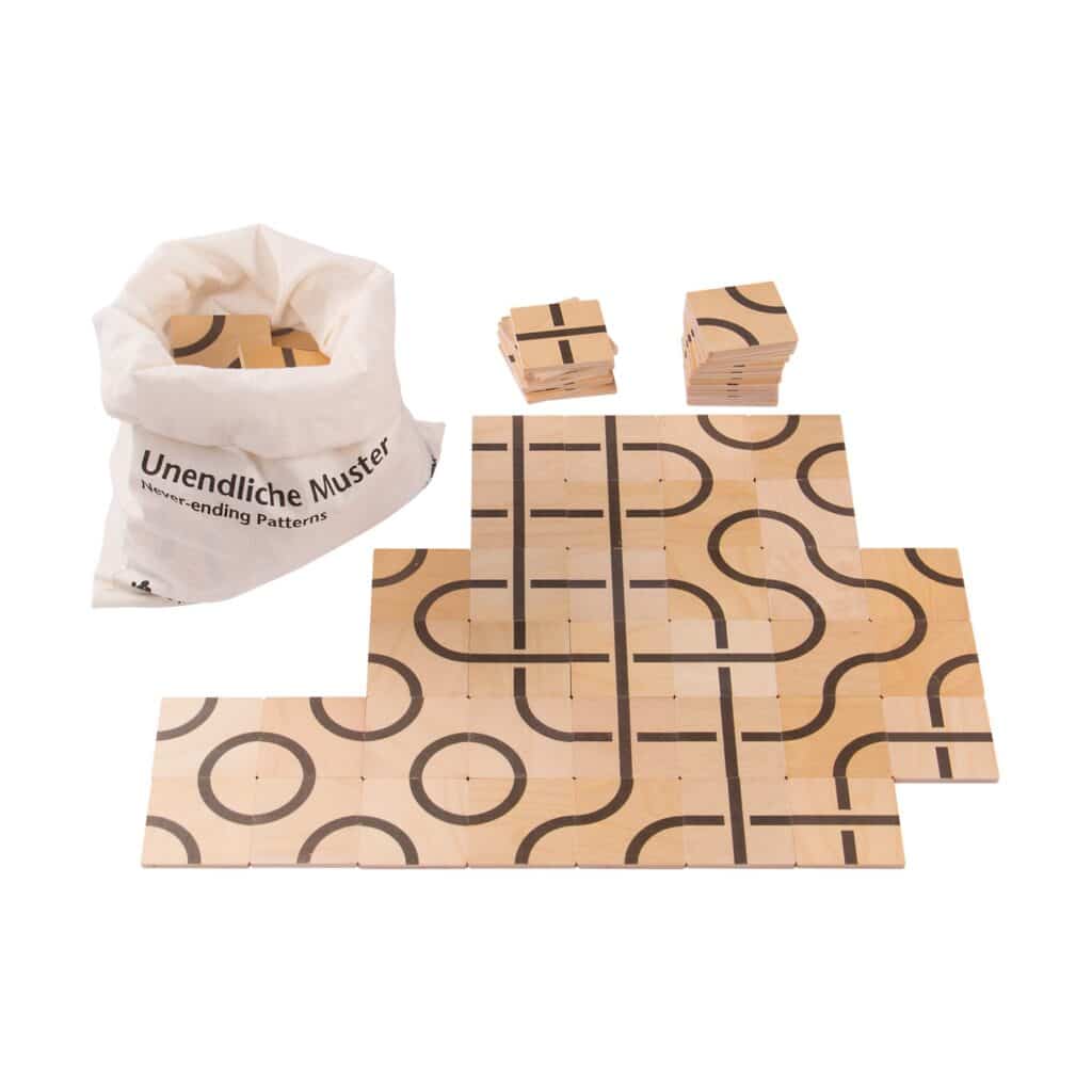Dank der hochwertigen Verarbeitung des Holzes und der farbenfrohen Drucke ist das Spiel nicht nur langlebig, sondern auch ästhetisch ansprechend. Es eignet sich ideal für Einzel- und Gruppenspiele und fördert wichtige Fähigkeiten wie das Abstraktionsvermögen, die Formendifferenzierung und die Kreativität. Ob auf einer großen Spielfläche, einem Bodenteppich oder einem großen Tisch – „Unendliche Muster“ passt sich flexibel an und sorgt für stundenlangen Spielspaß.