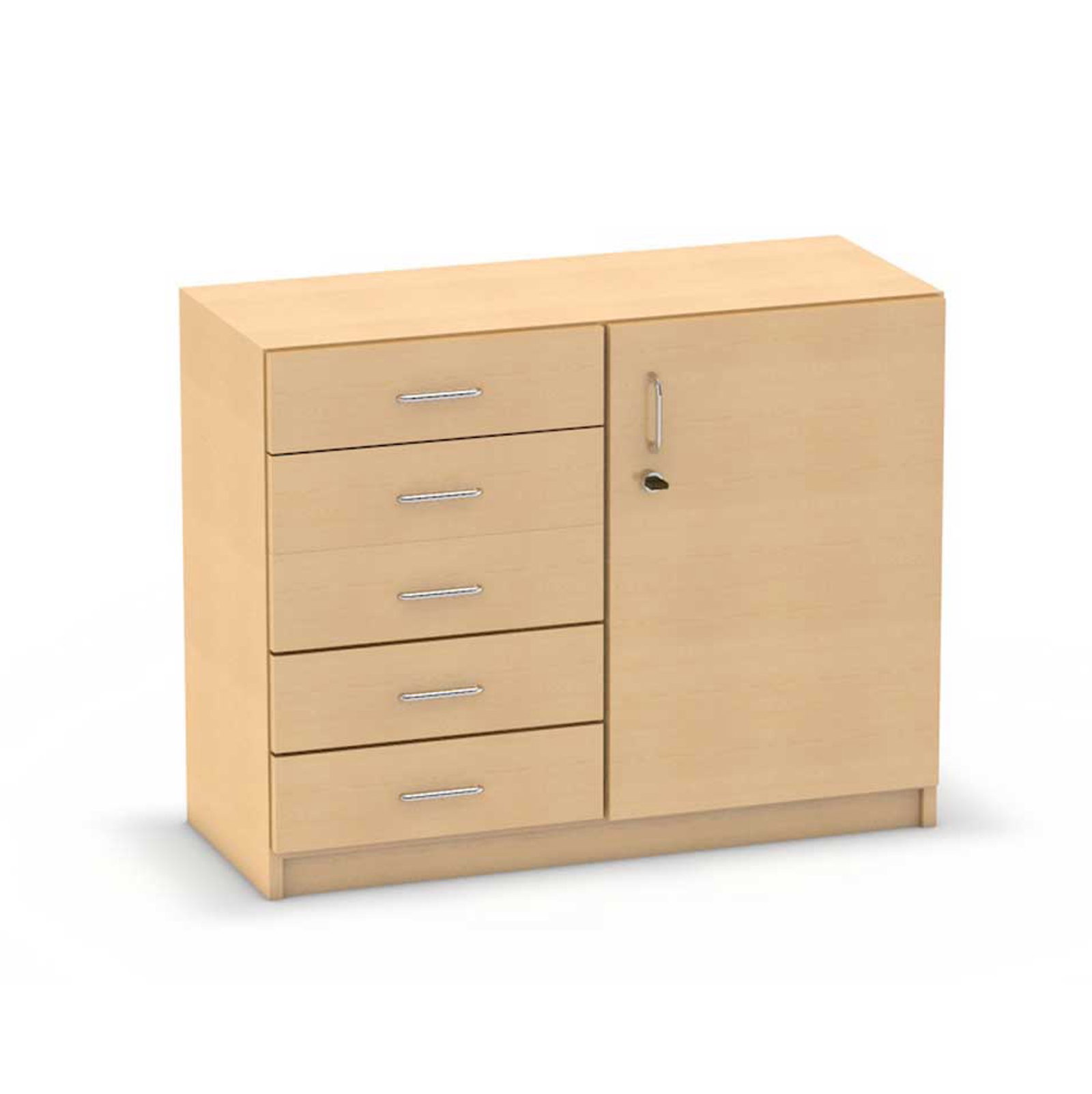 - Ausstattung: 1 aufliegende Tür (abschließbar), 2 verstellbare Einlegeböden, 5 Schubkästen