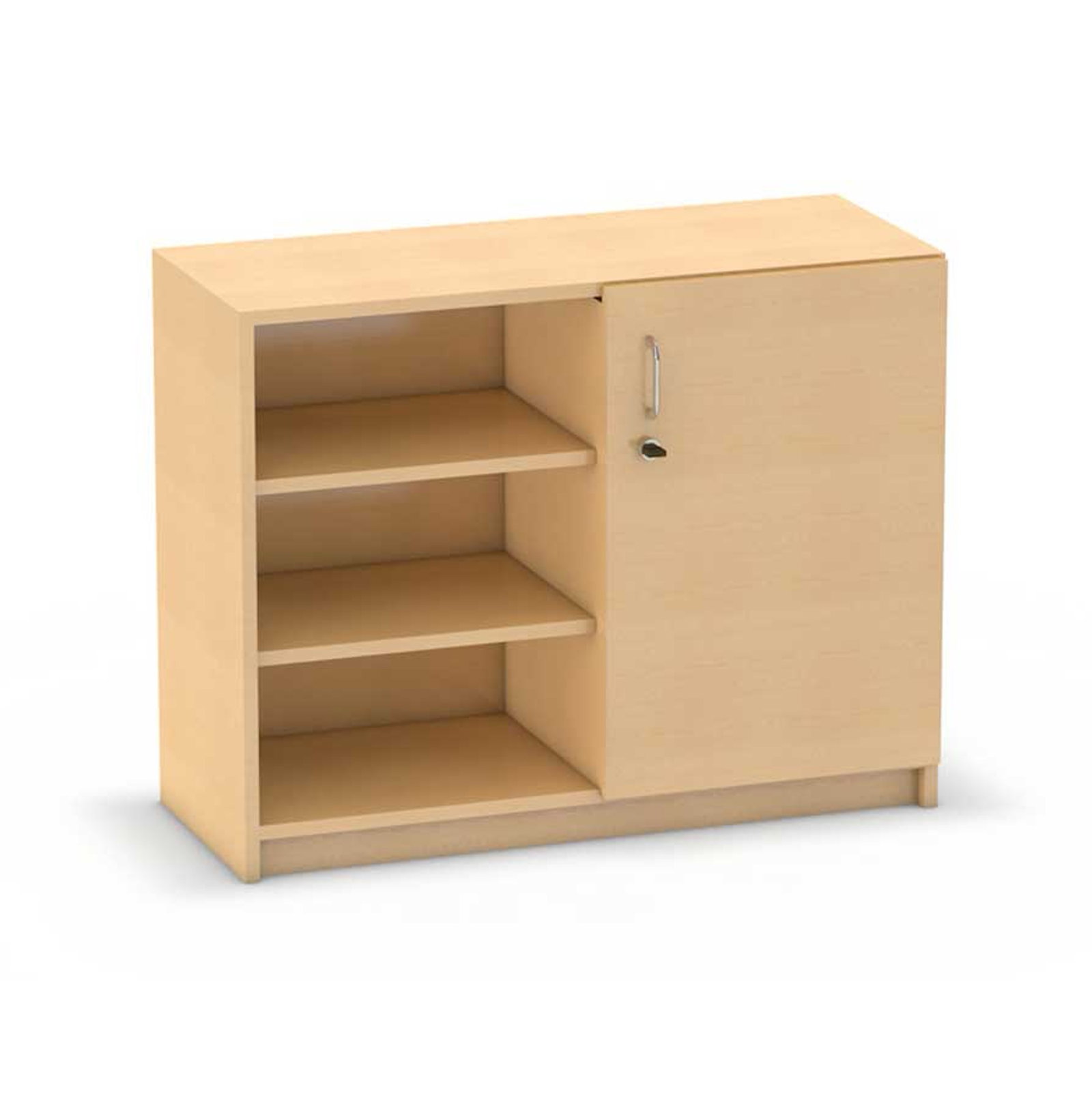 Das Herzstück dieses Möbelstücks ist sein asymmetrisches, äußerst praktisches Design. Die halboffene Gestaltung erlaubt es Ihnen, häufig benötigte Aktenordner, Fachliteratur oder Ablagekörbe direkt im offenen Regalteil zu platzieren. Dort stehen Ihnen zwei flexibel verstellbare Einlegeböden zur Verfügung. Die andere Schrankhälfte verbirgt sich hinter einer robusten, aufliegenden Tür und ist ebenfalls mit zwei höhenverstellbaren Einlegeböden ausgestattet. Damit Sie Ihre Arbeitsabläufe optimal unterstützen können, wählen Sie vorab, auf welcher Seite sich die Tür befinden soll – links oder rechts. Ein zuverlässiges Schloss in der Tür schützt wichtige Daten oder private Gegenstände sicher vor fremdem Zugriff.