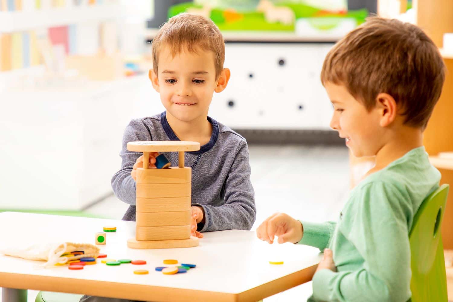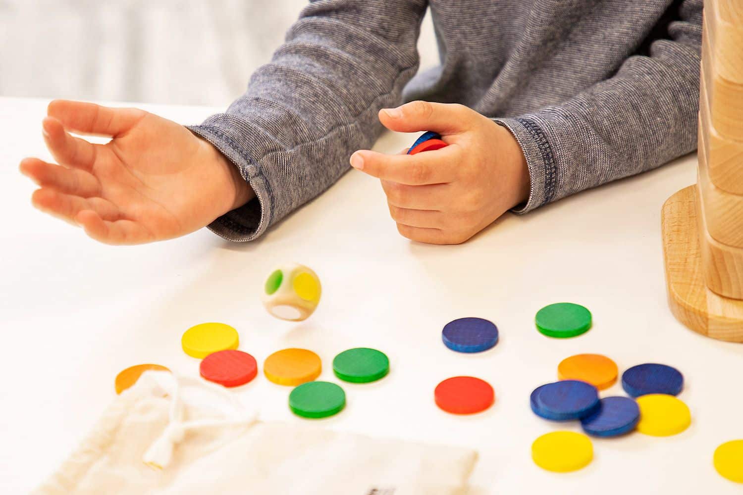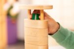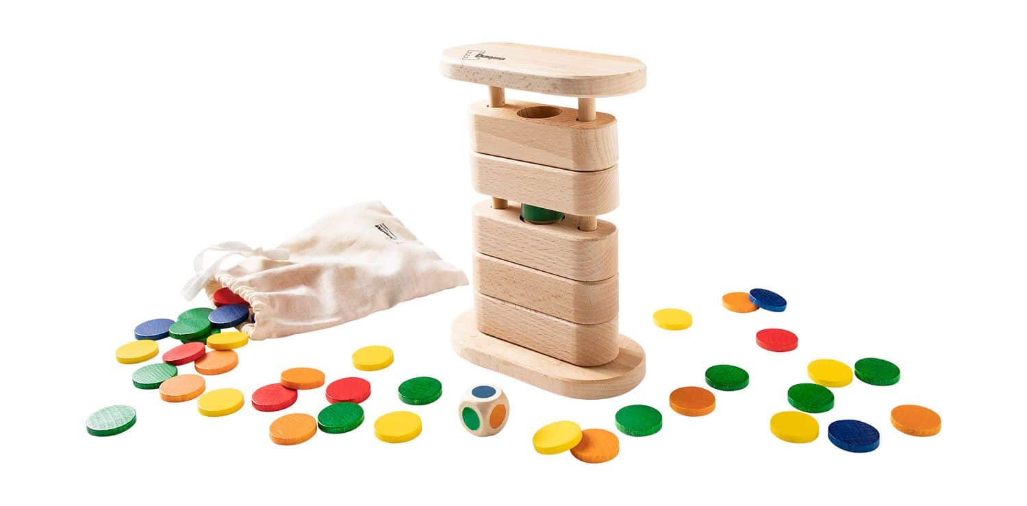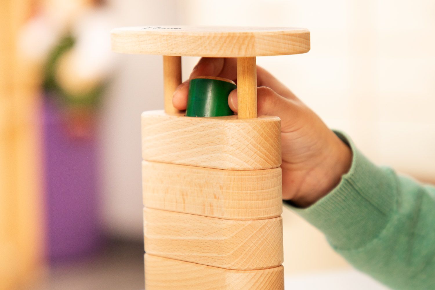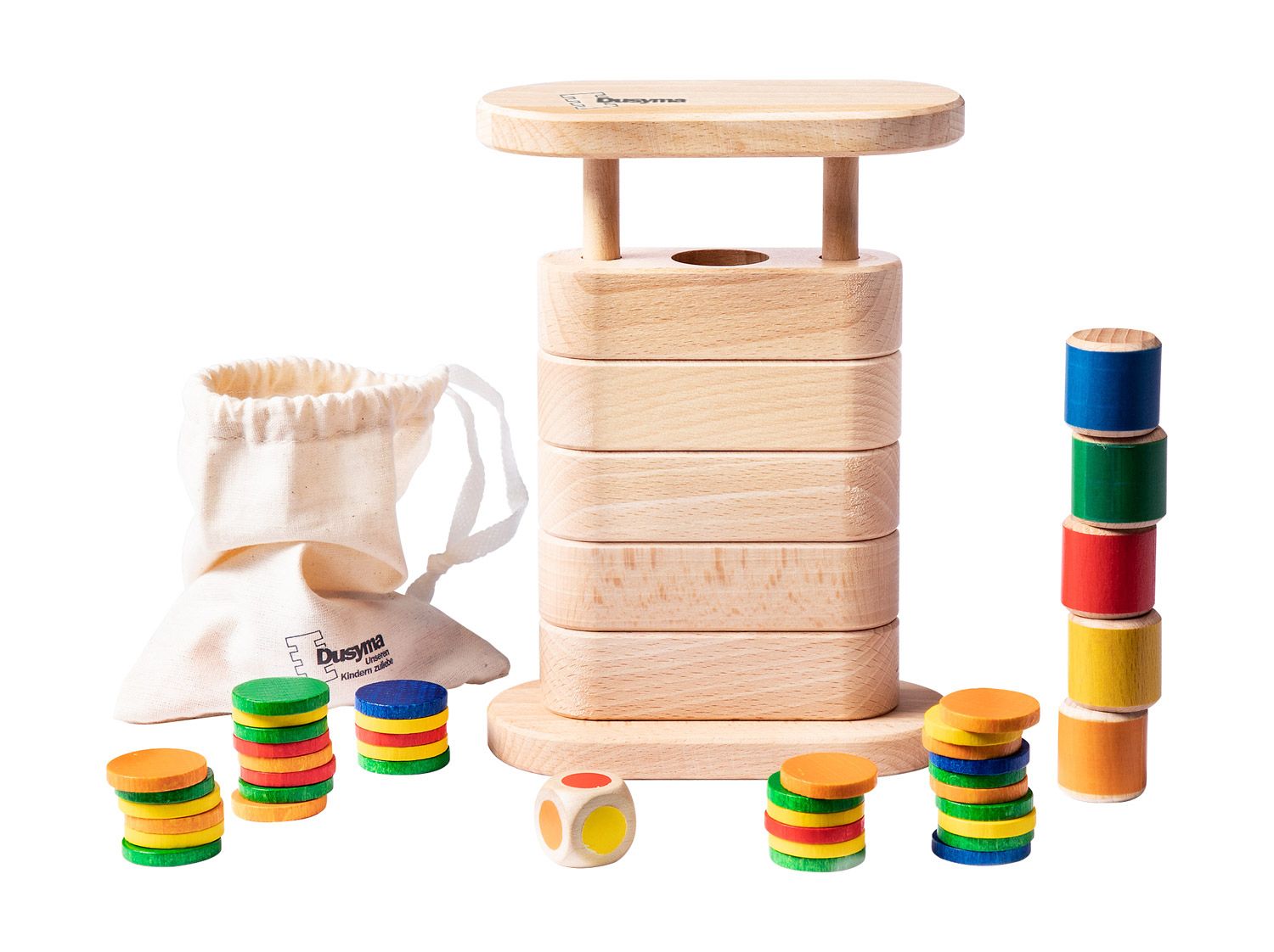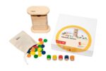 Dieses Set enthält alles, was Sie benötigen: einen Spielturm mit einer Höhe von 18,5 cm, bestehend aus zwei Grundplatten, zwei Holzstäben und fünf Schiebeelementen. Hinzu kommen fünf Farbzylinder, 60 farbige Chips (Ø 2,5 cm) in leuchtenden Farben, einen kleinen Baumwollbeutel und einen Farbwürfel mit einer Kantenlänge von 2 cm. Hergestellt aus massivem Buchenholz und 100% Baumwolle, bietet das Spiel eine sichere und langlebige Nutzung.