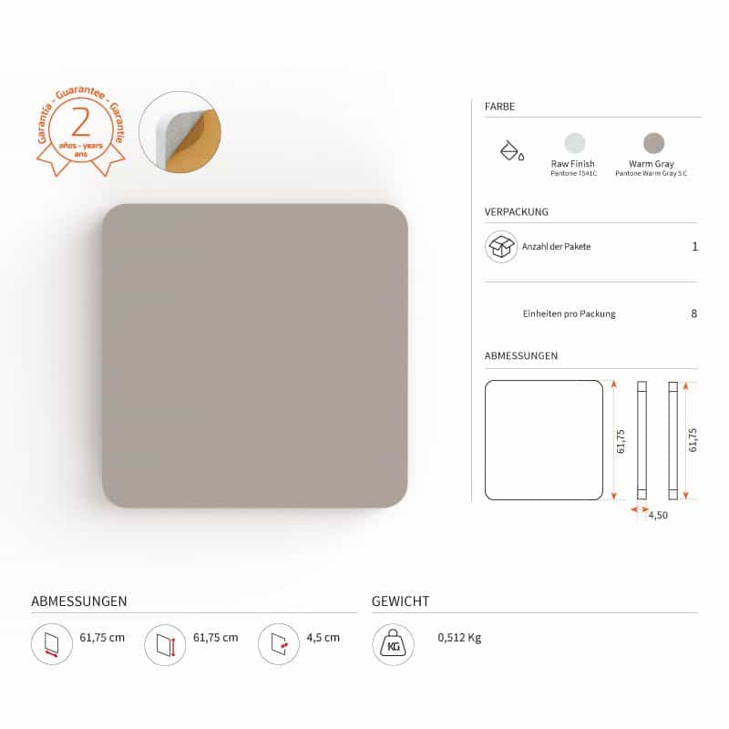 Das Set beinhaltet 8 selbstklebende Paneele, die sowohl als Wand- als auch als Deckenpaneel eingesetzt werden können. Mit Abmessungen von 61,75 cm x 61,75 cm und einer Höhe von 4,5 cm sind sie vielseitig einsetzbar und fügen sich harmonisch in jede Umgebung ein. Die Paneele sind in zwei stilvollen Farbtönen erhältlich – Pantone 7541 C (Grauweiß) und Pantone Warm Gray 5 C (Braungrau) – und bieten Ihnen die Möglichkeit, einen individuellen Akzent in Ihren Räumen zu setzen.