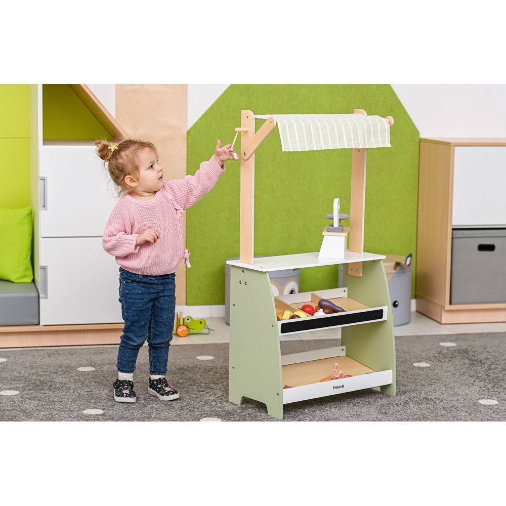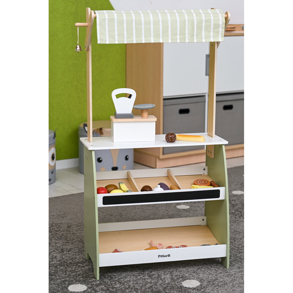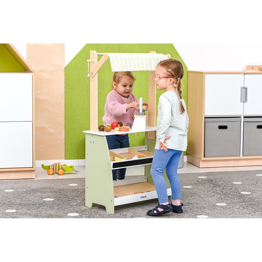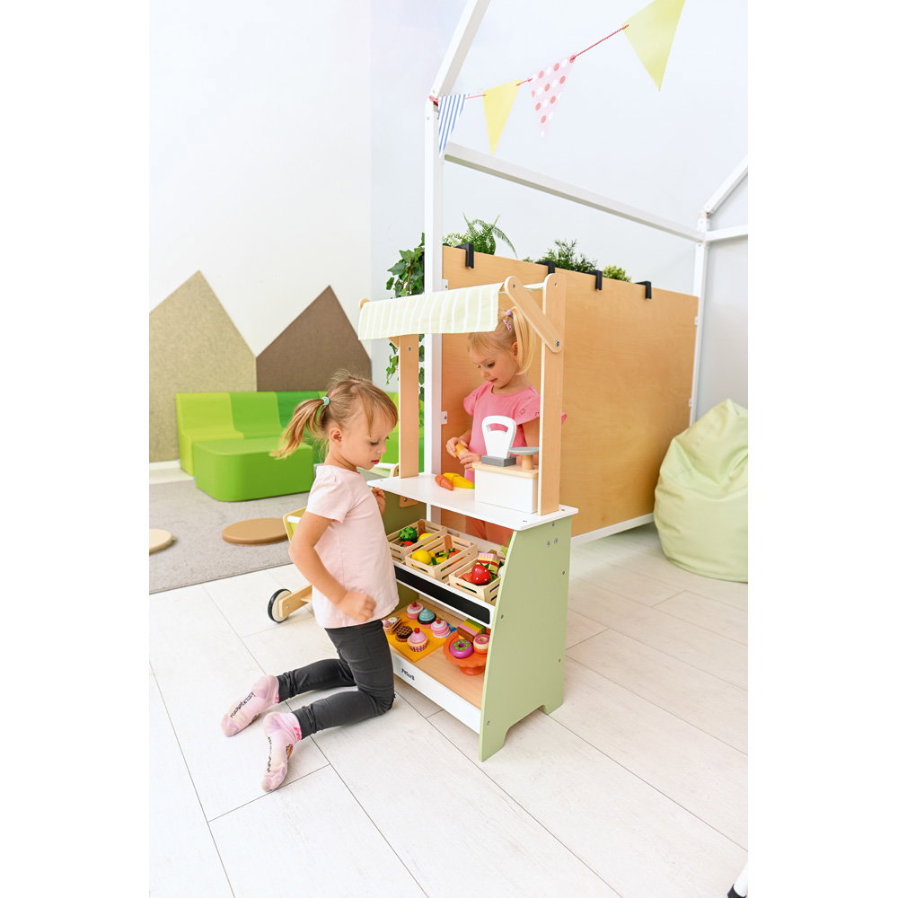 Der Verkaufsstand wurde mit vielen authentischen Details ausgestattet, die für ein realistisches Spielgefühl sorgen. Ein charmantes Stoffvordach schützt die ausgestellte Ware vor der Sonne und verleiht dem Stand sein typisches Markt-Aussehen. Mit der kleinen Glocke können Kunden auf sich aufmerksam machen, wenn sie einen Wunsch haben oder bezahlen möchten. Ein besonderes Highlight ist die integrierte schwarze Tafel. Hier können die kleinen Händler ihrer Kreativität freien Lauf lassen: Sie schreiben die Tagesangebote darauf, notieren die Preise für die einzelnen Produkte oder malen einfach ein einladendes Bild. So wird der Stand jeden Tag aufs Neue individuell gestaltet.
