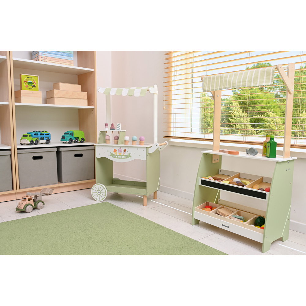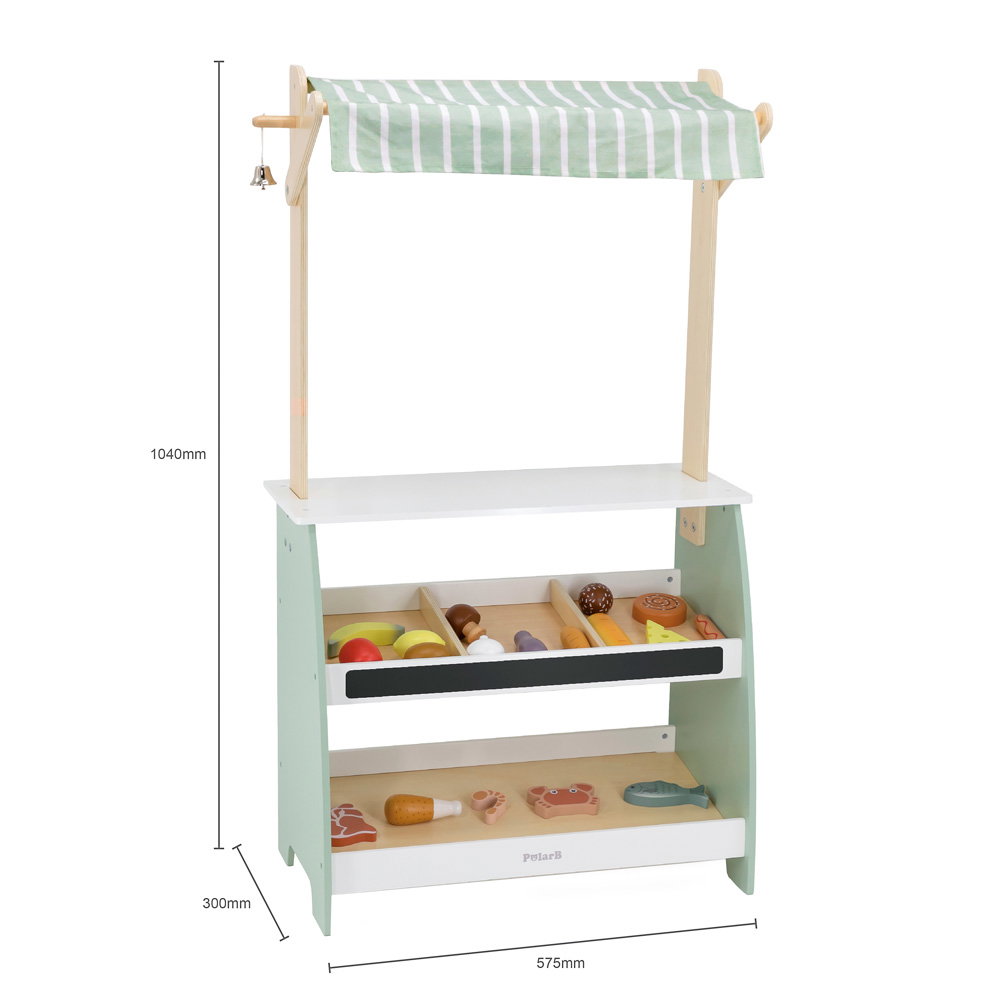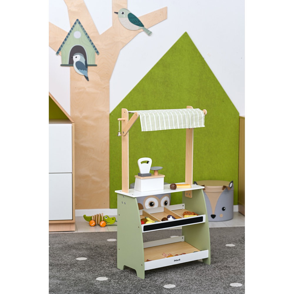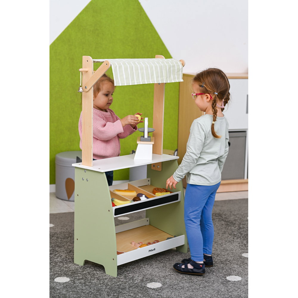 Der Verkaufsstand wurde mit vielen authentischen Details ausgestattet, die für ein realistisches Spielgefühl sorgen. Ein charmantes Stoffvordach schützt die ausgestellte Ware vor der Sonne und verleiht dem Stand sein typisches Markt-Aussehen. Mit der kleinen Glocke können Kunden auf sich aufmerksam machen, wenn sie einen Wunsch haben oder bezahlen möchten. Ein besonderes Highlight ist die integrierte schwarze Tafel. Hier können die kleinen Händler ihrer Kreativität freien Lauf lassen: Sie schreiben die Tagesangebote darauf, notieren die Preise für die einzelnen Produkte oder malen einfach ein einladendes Bild. So wird der Stand jeden Tag aufs Neue individuell gestaltet.