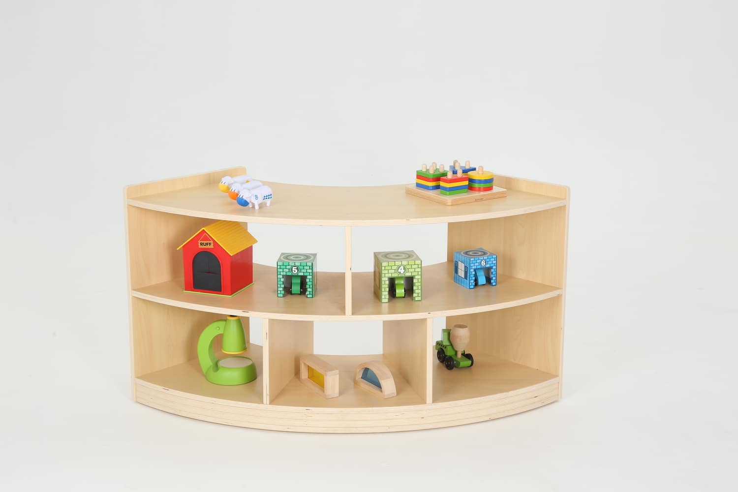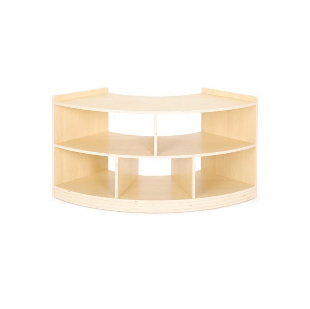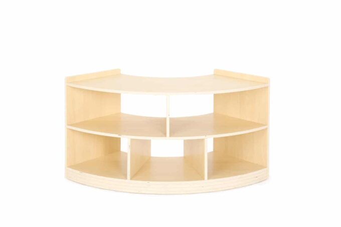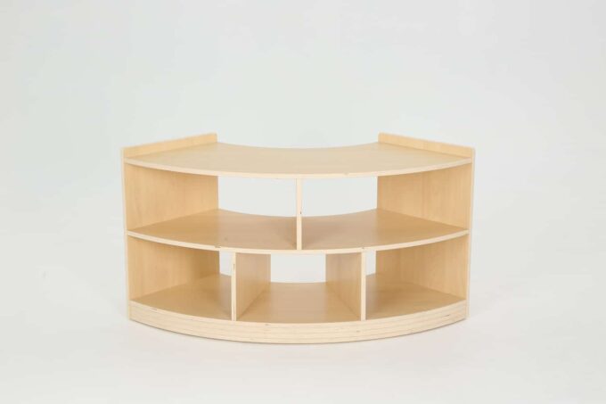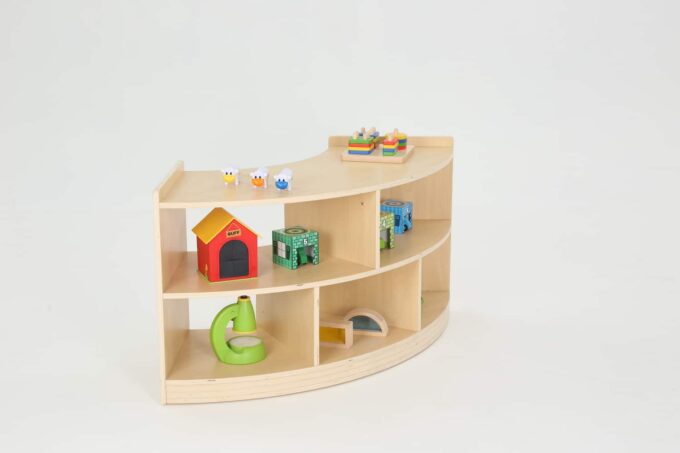 Das Viertelkreis Raumteiler-Regal von WISDOM vereint durchdachtes Design mit pädagogischem Nutzen. Es strukturiert Räume auf ansprechende Weise, fördert die Selbstständigkeit der Kinder und überzeugt durch hohe Stabilität und Langlebigkeit.