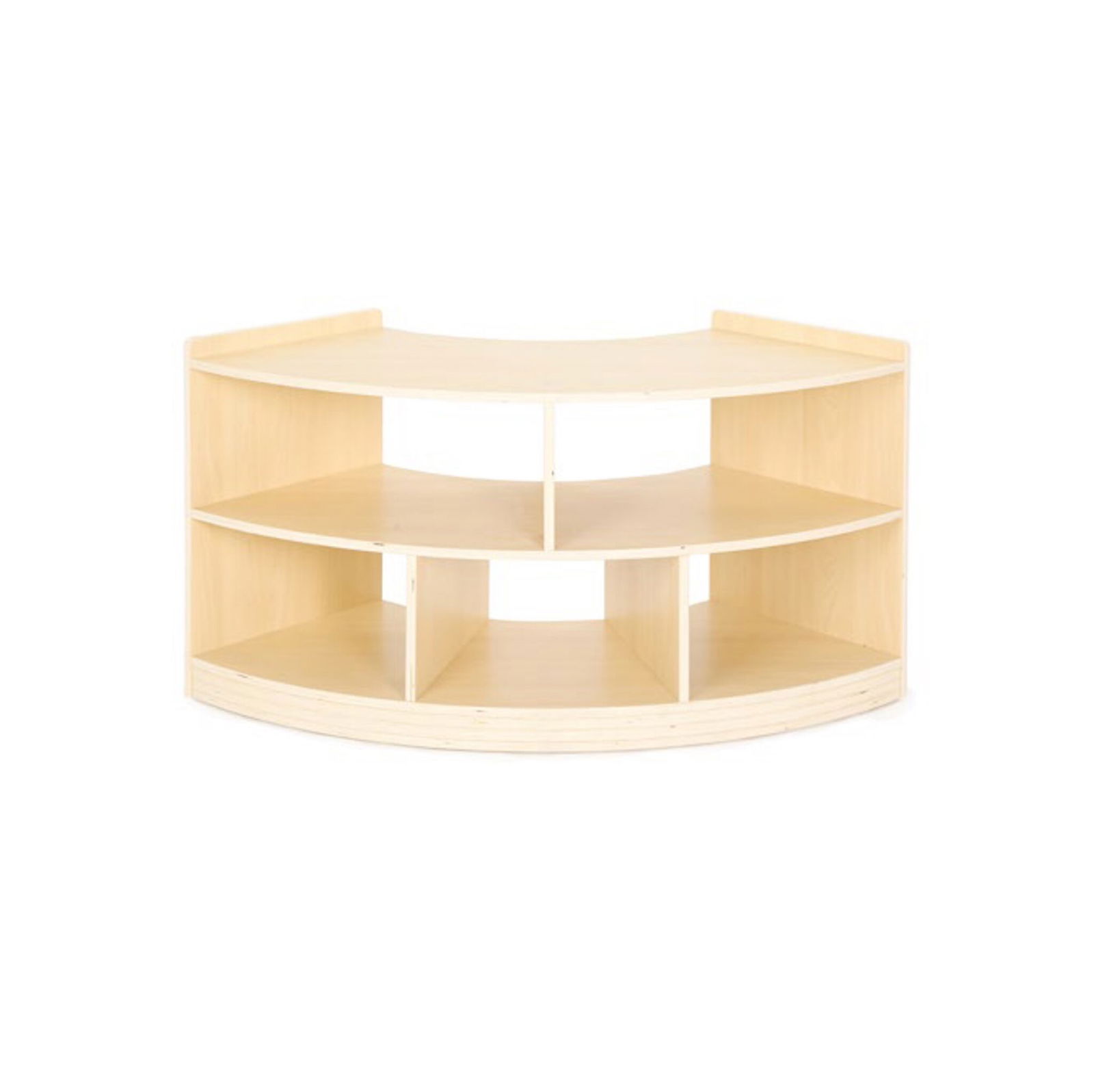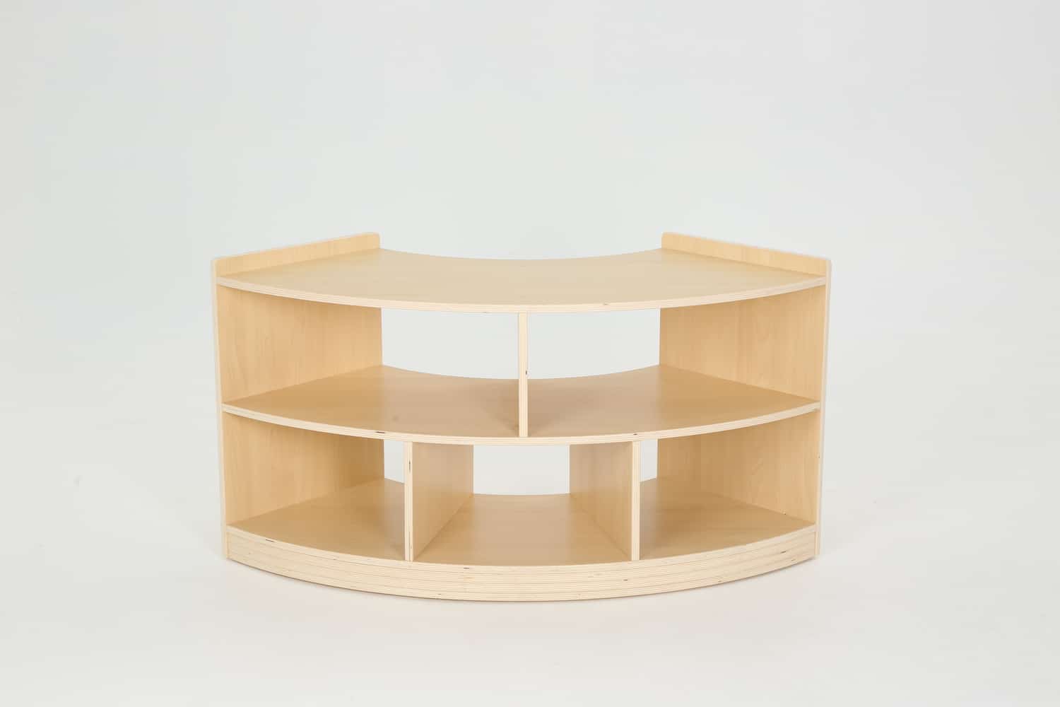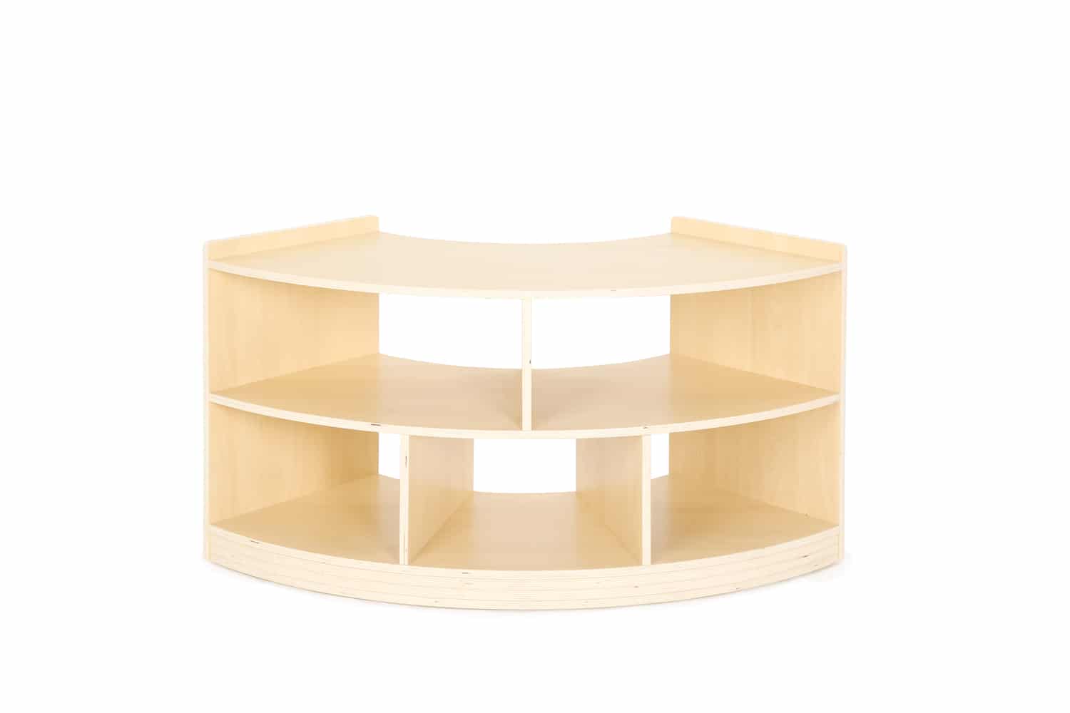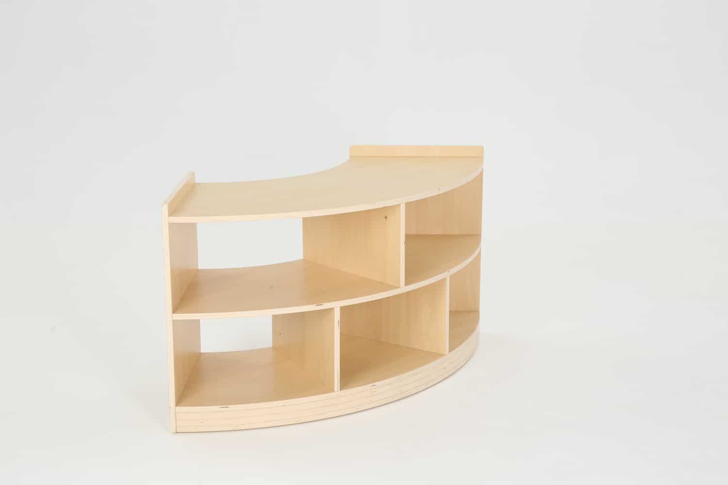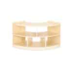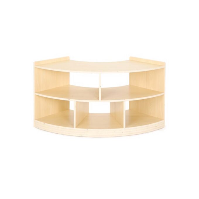 Durch seine abgerundete Form lässt sich das Regal optimal in Raumecken integrieren oder als geschwungener Abschluss eines Regalsystems nutzen. Es sorgt für harmonische Übergänge und schafft gleichzeitig zusätzliche Ablageflächen für Bücher, Spielmaterialien oder Dekorationen. Das warme Ahorn-Dekor in Kombination mit der robusten Melaminbeschichtung verleiht dem Möbelstück eine natürliche Optik und macht es widerstandsfähig gegen den Alltag in lebhaften Räumen.