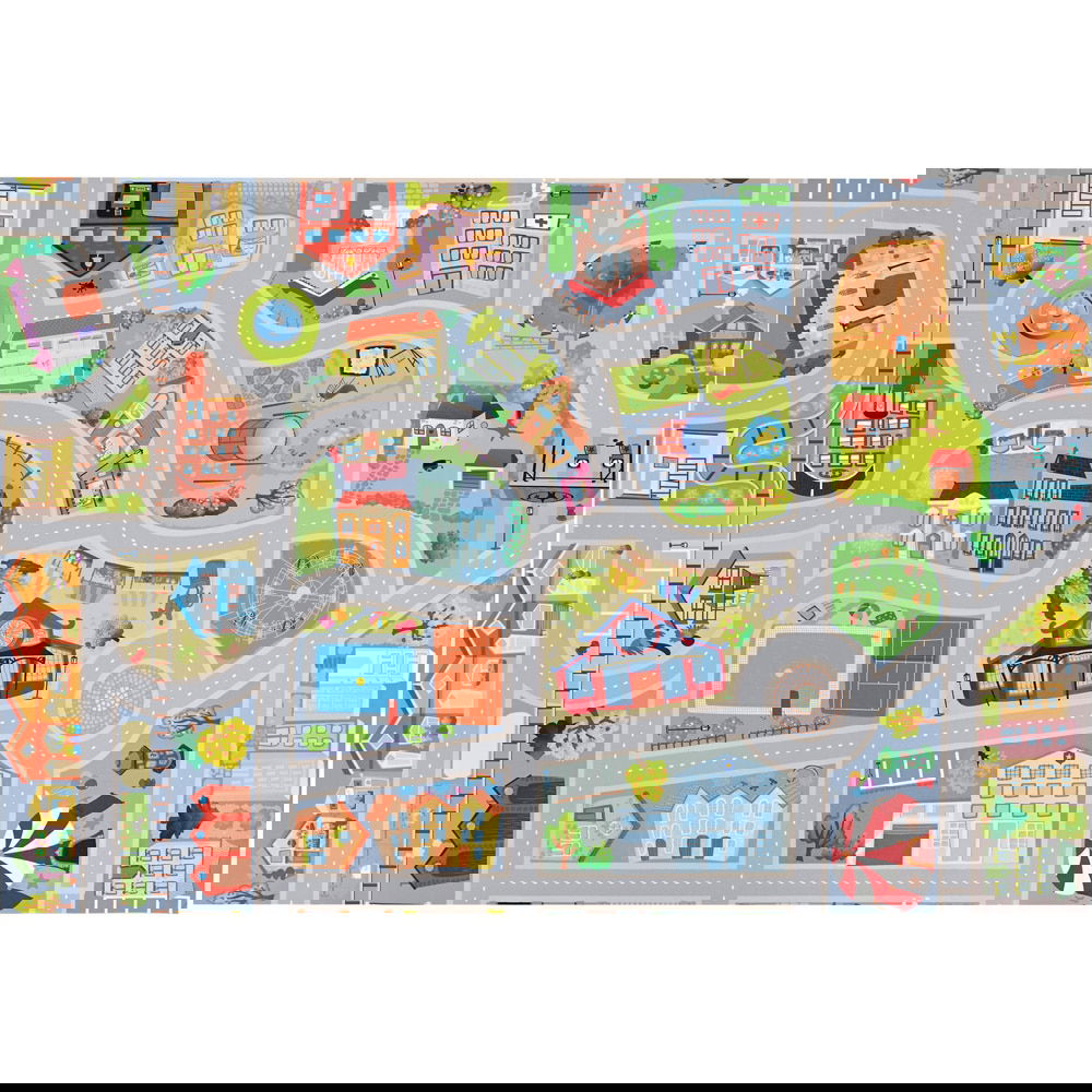 Vinyl-Kindergartenteppich, Siedlung. Dieser Teppich für den Kindergarten zeichnet sich durch seine Funktionalität und einfache Pflege aus. Dank seiner UV-Beständigkeit eignet er sich für den Einsatz drinnen wie draußen.