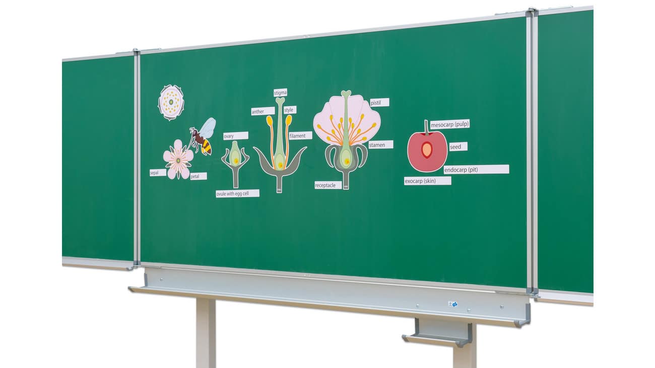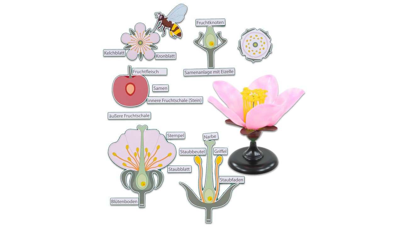 Das umfangreiche Set, bestehend aus insgesamt 23 magnetischen Teilen, ermöglicht es Ihnen, jeden Schritt des verwandlungsreichen Prozesses von der Blüte zur Frucht direkt an der Tafel zu zeigen. Wie entsteht eine Kirsche aus der zarten Kirschblüte? Mit dem Modell können Sie den Schülern leicht erklären, was unter Bestäubung und Befruchtung zu verstehen ist. Lassen Sie das Publikum auch mitverfolgen, wie die Biene in die Blüte hineinkrabbelt, um Nektar zu sammeln!