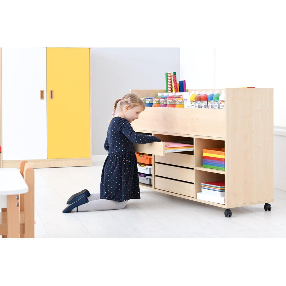 • Viel Stauraum Der Wagen verfügt über vier praktische Schubfächer, die ideal für kleinere Materialien wie Stifte, Papier oder Bastelzubehör geeignet sind. Zusätzlich bietet ein geräumiges Fach Platz für bis zu fünf flache Kunststoffbehälter, die separat erhältlich sind. Damit lässt sich der Stauraum individuell erweitern und an die Bedürfnisse anpassen.