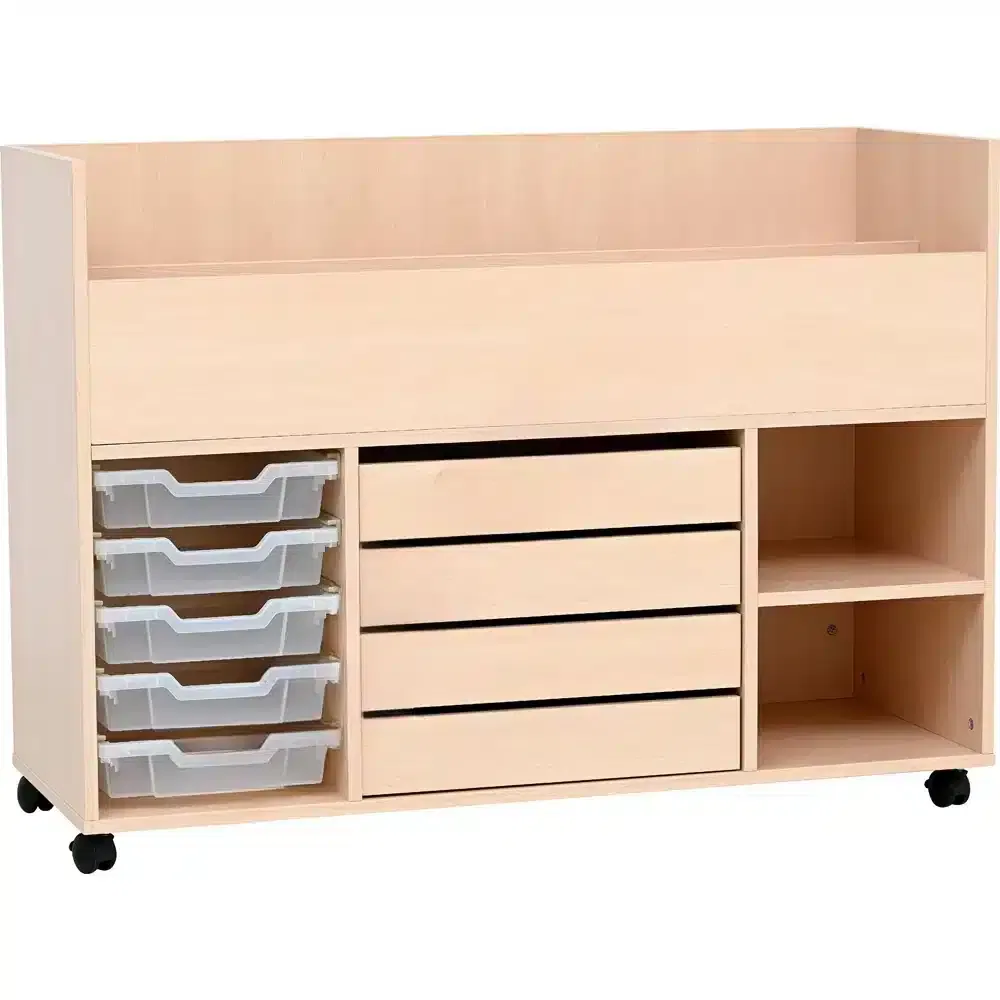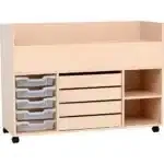 Unser Wagen für Zeichnungen & Spielsachen aus Ahorn-Optik bietet vielfältigen Stauraum und einfache Mobilität. Ideal für jede kreative Lernumgebung im Kindergarten. 🚀📚✨