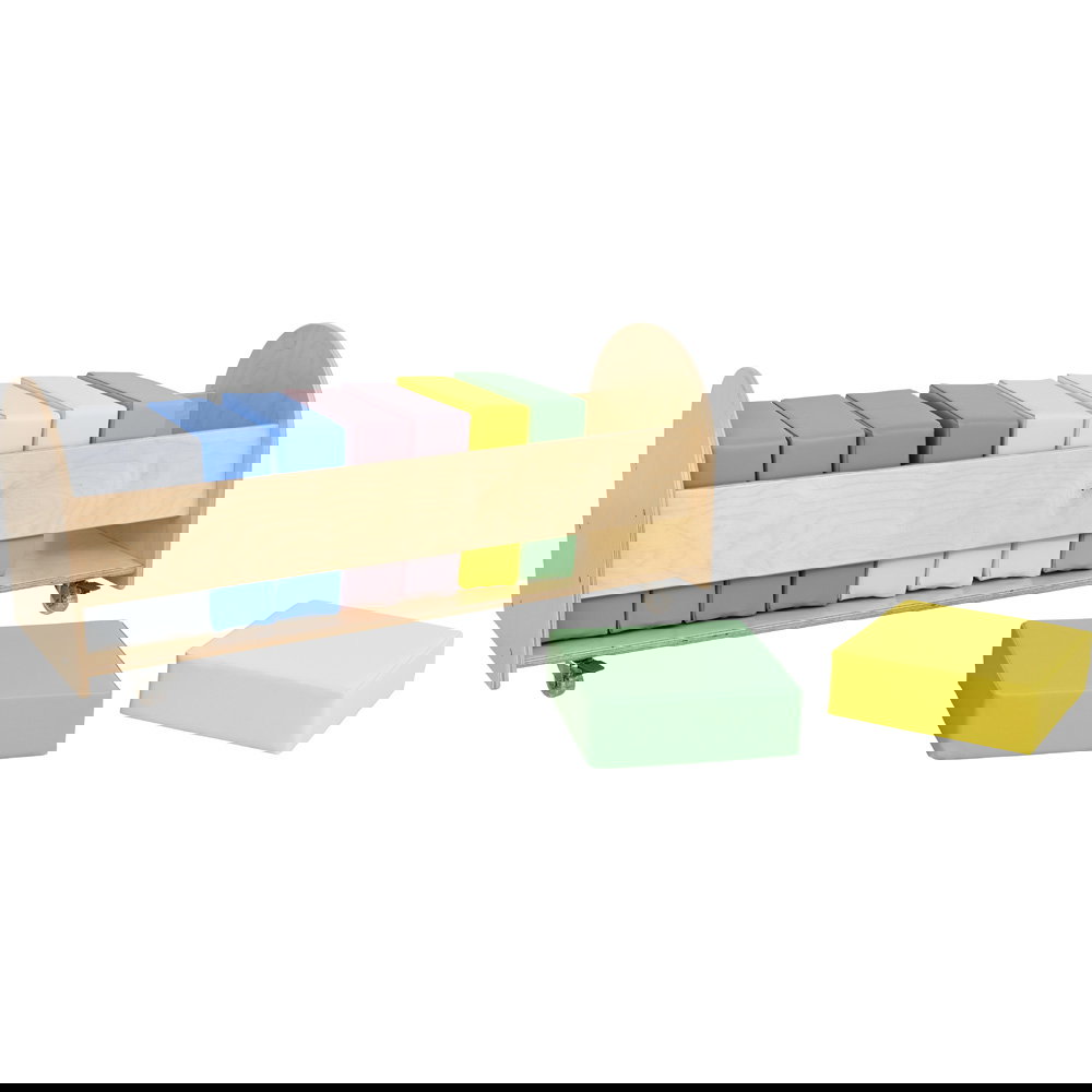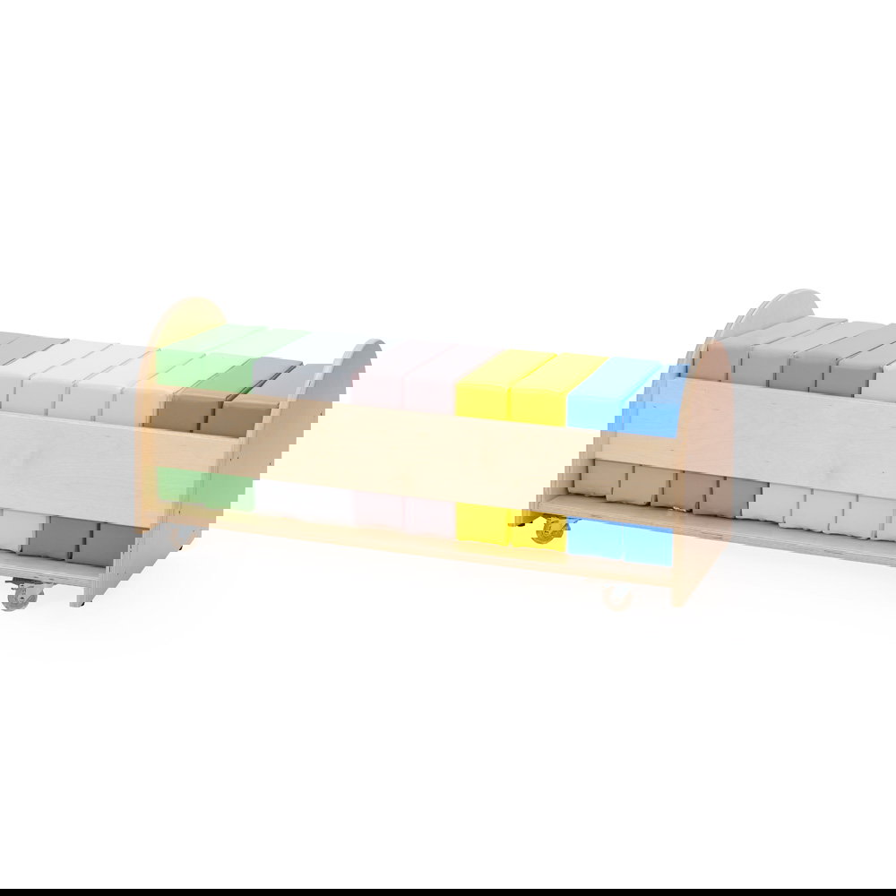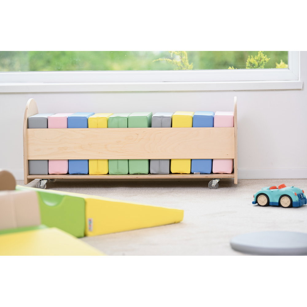 Der dazugehörige Transportwagen besteht aus robustem Sperrholz und hält der täglichen Beanspruchung problemlos stand. Er verfügt über vier leichtgängige Rollen, von denen zwei sicher feststellbar sind. Das verhindert ein ungewolltes Wegrollen und sorgt für einen festen Stand, wenn die Kinder ihre Kissen selbstständig entnehmen oder nach dem Gebrauch wieder einräumen. Die sanften Pastelltöne der Kissen – jeweils zwei pro Farbe – fügen sich harmonisch in Ihre Räumlichkeiten ein und schaffen eine ruhige, entspannte Atmosphäre.